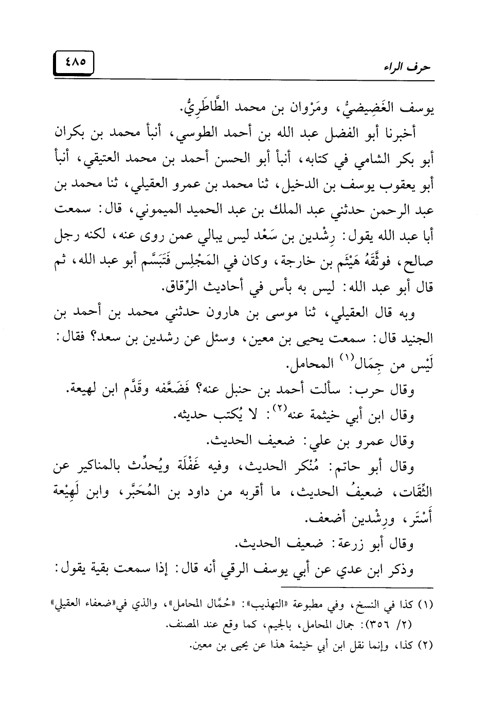 وبه قال العقيلي، ثنا موسي بن هارون حدثني محمد بن أحمد بن الجنيد قال: سمعت يحيى بن معين، وسئل عن رشدين بن سعد؟ فقال: لَيْس من جِمَال (¬١) المحامل.