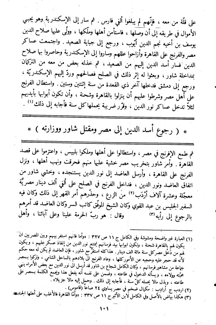 [1] العبارة غير واضحة ومشوشة وفي الكامل ج 11 ص 327: «وأما فإنهم استقر بينهم وبين المصريين ان يكون لهم بالقاهرة شحنة، وتكون أبوابها بيد فرسانهم ليمتنع نور الدين من إنفاذ عسكر عليهم، ويكون لهم من دخل مصر كل سنة مائة ألف دينار. هذا كله استقرّ مع شاور، فإن العاضد لم يكن له معه حكم لأنه قد حجر عليه وحجبه عن الأمور كلها، وعاد الفرنج الى بلادهم بالساحل الشامي، وتركوا بمصر جماعة من مشاهير فرسانهم، وكان الكامل شجاع بن شاور قد أرسل الى نور الدين مع بعض الأمراء ينهي محبّته وولاءه، ويسأله الدخول في طاعته، وضمن على نفسه أنه يفعل هذا ويجمع الكلمة بمصر على طاعته، وبذل مالا يحمله كلّ سنة، فأجابه إلى ذلك. وحمل إليه مالا جزيلا»