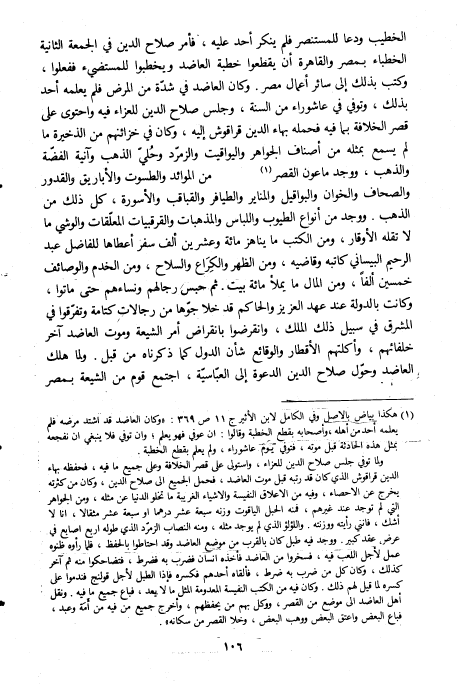 [1] هكذا بياض بالأصل وفي الكامل لابن الأثير ج 11 ص 369: «وكان العاضد قد اشتد مرضه فلم يعلمه أحد من أهله، وأصحابه بقطع الخطبة وقالوا: ان عوفي فهو يعلم، وان توفي فلا ينبغي ان نفجعه بمثل هذه الحادثة قبل موته، فتوفي يوم عاشوراء، ولم يعلم بقطع الخطبة.