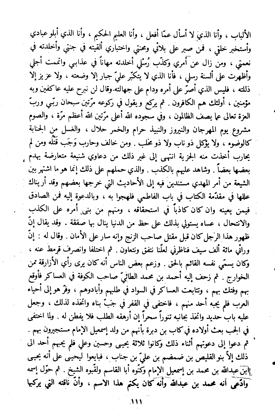 الألباب، وأنا الّذي لا أسأل عمّا أفعل، وأنا العليم الحكيم، وأنا الّذي أبلو عبادي وأستخبر خلقي، فمن صبر على بلائي ومحنتي واختباري ألقيته في جنتي وأخلدته في نعمتي، ومن زال عن أمري وكذّب رسلي أخلدته مهانا في عذابي وأتممت أجلي وأظهرت على ألسنة رسلي، فأنا الّذي لا يتكبّر عليّ جبار إلا وضعته، ولا عزيز إلا ذللته، فليس الّذي أصرّ على أمره ودام على جهالته. وقال لن نبرح عليه عاكفين وبه مؤمنين، أولئك هم الكافرون. ثم يركع ويقول في ركوعه مرّتين سبحان ربّي وربّ العزة تعالى عما يصف الظالمون، وفي سجوده الله أعلى مرّتين الله أعظم مرّة، والصوم مشروع يوم المهرجان والنيروز والنبيذ حرام والخمر حلال، والغسل من الجنابة كالوضوء، ولا يؤكل ذو ناب ولا ذو مخلب. ومن خالف وحارب وجب قتله ومن لم يحارب أخذت منه الجزية انتهى إلى غير ذلك من دعاوي شنيعة متعارضة يهدم بعضها بعضا. وشاهد عليهم بالكذب. والّذي حملهم على ذلك إنما هو ما اشتهر بين الشيعة من أمر المهدي مستندين فيه إلى الأحاديث التي خرجها بعضهم وقد أريناك عللها في مقدّمة الكتاب في باب الفاطمي فلهجوا به، وبالدعوة إليه فمن الصادق فيمن يعينه وان كان كاذبا في استحقاقه، ومنهم من بنى أمره على الكذب والانتحال، عساه يستولي بذلك على حظ من الدنيا ينال بها صفقة. وقد يقال إنّ ظهور هذا الرجل كان قبل مقتل صاحب الزنج وإنه سار على الأمان. وقال له: إنّ ورائي مائة ألف سيف فناظرني لعلّنا نتفق ونتعاون. ثم اختلفا وانصرف قرمط عنه، وكان يسمّي نفسه القائم بالحق. وزعم بعض الناس أنه كان يرى رأي الأزارقة من الخوارج. ثم زحف إليه أحمد بن محمد الطائيّ صاحب الكوفة في العساكر فأوقع بهم وفتك بهم، وتتابعت العساكر في السواد في طلبهم وأبادوهم، وفرّ هو إلى أحياء العرب فلم يجبه أحد منهم، فاختفى في القفر في جبّ بناه واتخذه لذلك، وجعل عليه باب حديد واتخذ بجانبه تنورا سحرا إن أرهقه الطلب فلا يفطن له. ولما اختفى في الجب بعث أولاده في كاب بن دبرة بأنهم من ولد إسماعيل الإمام مستجيرون بهم.