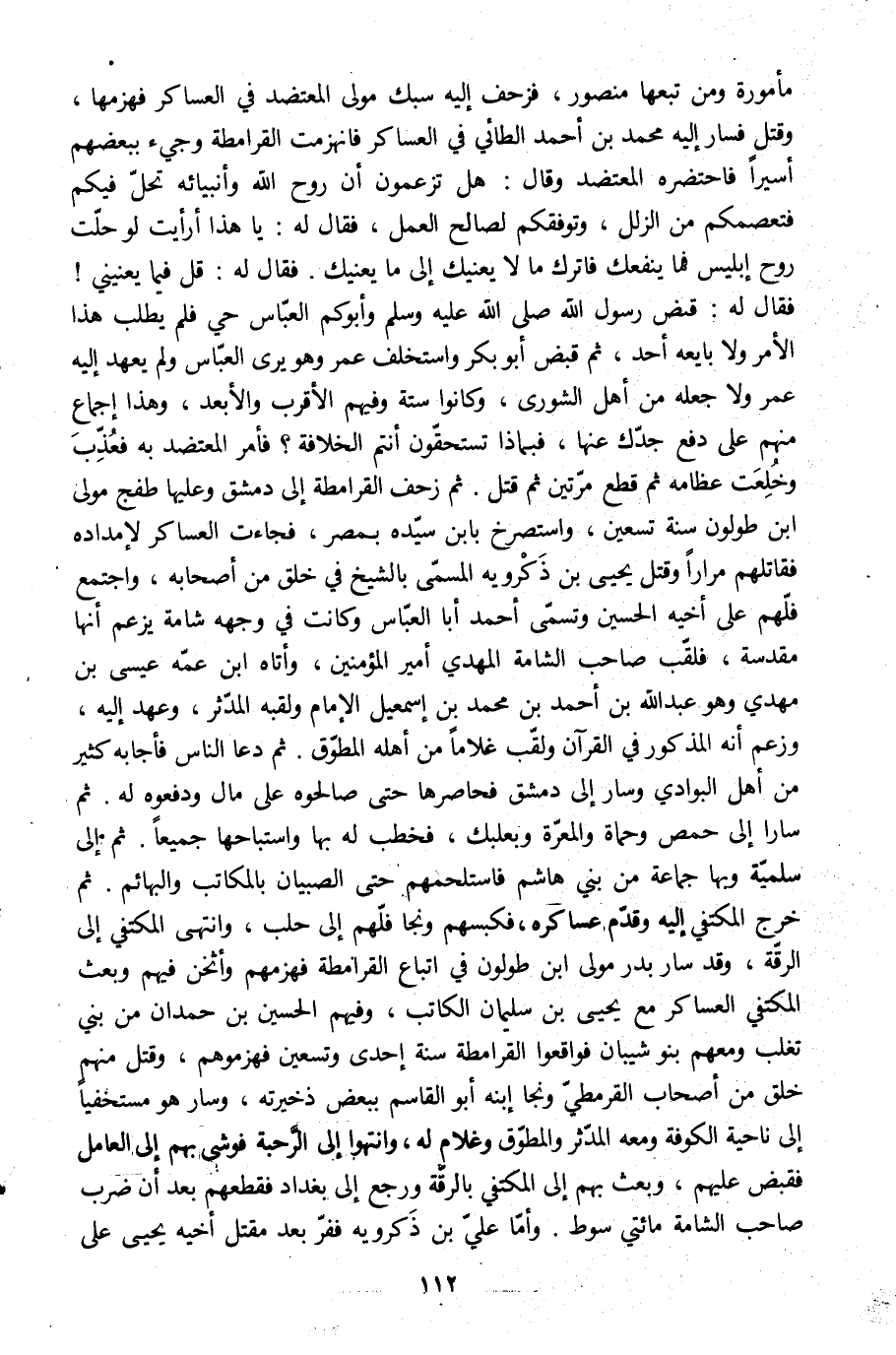 مأمورة ومن تبعها منصور، فزحف إليه سبك مولى المعتضد في العساكر فهزمها، وقتل فسار إليه محمد بن أحمد الطائي في العساكر فانهزمت القرامطة وجيء ببعضهم أسيرا فاحتضره المعتضد وقال: هل تزعمون أن روح الله وأنبيائه تحلّ فيكم فتعصمكم من الزلل، وتوفقكم لصالح العمل، فقال له: يا هذا أرأيت لو حلّت روح إبليس فما ينفعك فاترك ما لا يعنيك إلى ما يعنيك. فقال له: قل فيما يعنيني! فقال له: قبض رسول الله صلى الله عليه وسلم وأبوكم العبّاس حي فلم يطلب هذا الأمر ولا بايعه أحد، ثم قبض أبو بكر واستخلف عمر وهو يرى العبّاس ولم يعهد إليه عمر ولا جعله من أهل الشورى، وكانوا ستة وفيهم الأقرب والأبعد، وهذا إجماع منهم على دفع جدّك عنها، فبماذا تستحقّون أنتم الخلافة؟ فأمر المعتضد به فعذّب وخلعت عظامه ثم قطع مرّتين ثم قتل. ثم زحف القرامطة إلى دمشق وعليها طفج مولى ابن طولون سنة تسعين، واستصرخ بابن سيّده بمصر، فجاءت العساكر لإمداده فقاتلهم مرارا وقتل يحيى بن ذكرويه المسمّى بالشيخ في خلق من أصحابه، واجتمع فلّهم على أخيه الحسين وتسمّى أحمد أبا العبّاس وكانت في وجهه شامة يزعم أنها مقدسة، فلقّب صاحب الشامة المهدي أمير المؤمنين، وأتاه ابن عمّه عيسى بن مهدي وهو عبد الله بن أحمد بن محمد بن إسماعيل الإمام ولقبه المدّثر، وعهد إليه، وزعم أنه المذكور في القرآن ولقّب غلاما من أهله المطوّق. ثم دعا الناس فأجابه كثير من أهل البوادي وسار إلى دمشق فحاصرها حتى صالحوه على مال ودفعوه له. ثم سارا إلى حمص وحماة والمعرّة وبعلبكّ، فخطب له بها واستباحها جميعا. ثم إلى سلميّة وبها جماعة من بني هاشم فاستلحمهم حتى الصبيان بالمكاتب والبهائم. ثم خرج المكتفي إليه وقدّم عساكره، فكبسهم ونجا فلّهم إلى حلب، وانتهى المكتفي إلى الرقّة، وقد سار بدر مولى ابن طولون في اتباع القرامطة فهزمهم وأثخن فيهم وبعث المكتفي العساكر مع يحيى بن سليمان الكاتب، وفيهم الحسين بن حمدان من بني تغلب ومعهم بنو شيبان فواقعوا القرامطة سنة إحدى وتسعين فهزموهم، وقتل منهم خلق من أصحاب القرمطيّ ونجا ابنه أبو القاسم ببعض ذخيرته، وسار هو مستخفيا إلى ناحية الكوفة ومعه المدّثر والمطوّق وغلام له، وانتهوا إلى الرّحبة فوشى بهم إلى العامل فقبض عليهم، وبعث بهم إلى المكتفي بالرقّة ورجع إلى بغداد فقطعهم بعد أن ضرب صاحب الشامة مائتي سوط. وأمّا عليّ بن ذكرويه ففرّ بعد مقتل أخيه يحيى على