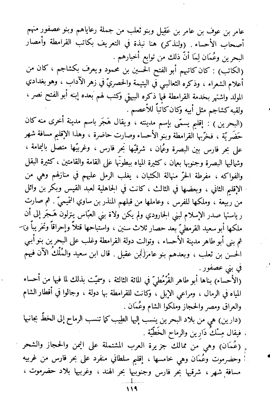 عامر بن عوف بن عامر بن عقيل وبنو ثعلب من جملة رعاياهم وبنو عصفور منهم أصحاب الأحساء. (ولنذكر) هنا نبذة في التعريف بكاتب القرامطة وأمصار البحرين وعمان لما أنّ ذلك من توابع أخبارهم.