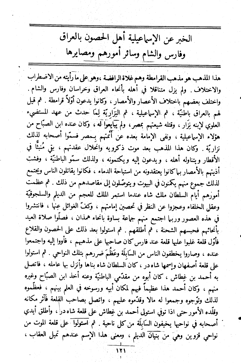الخبر عن الإسماعيلية أهل الحصون بالعراق وفارس والشام وسائر أمورهم ومصايرها