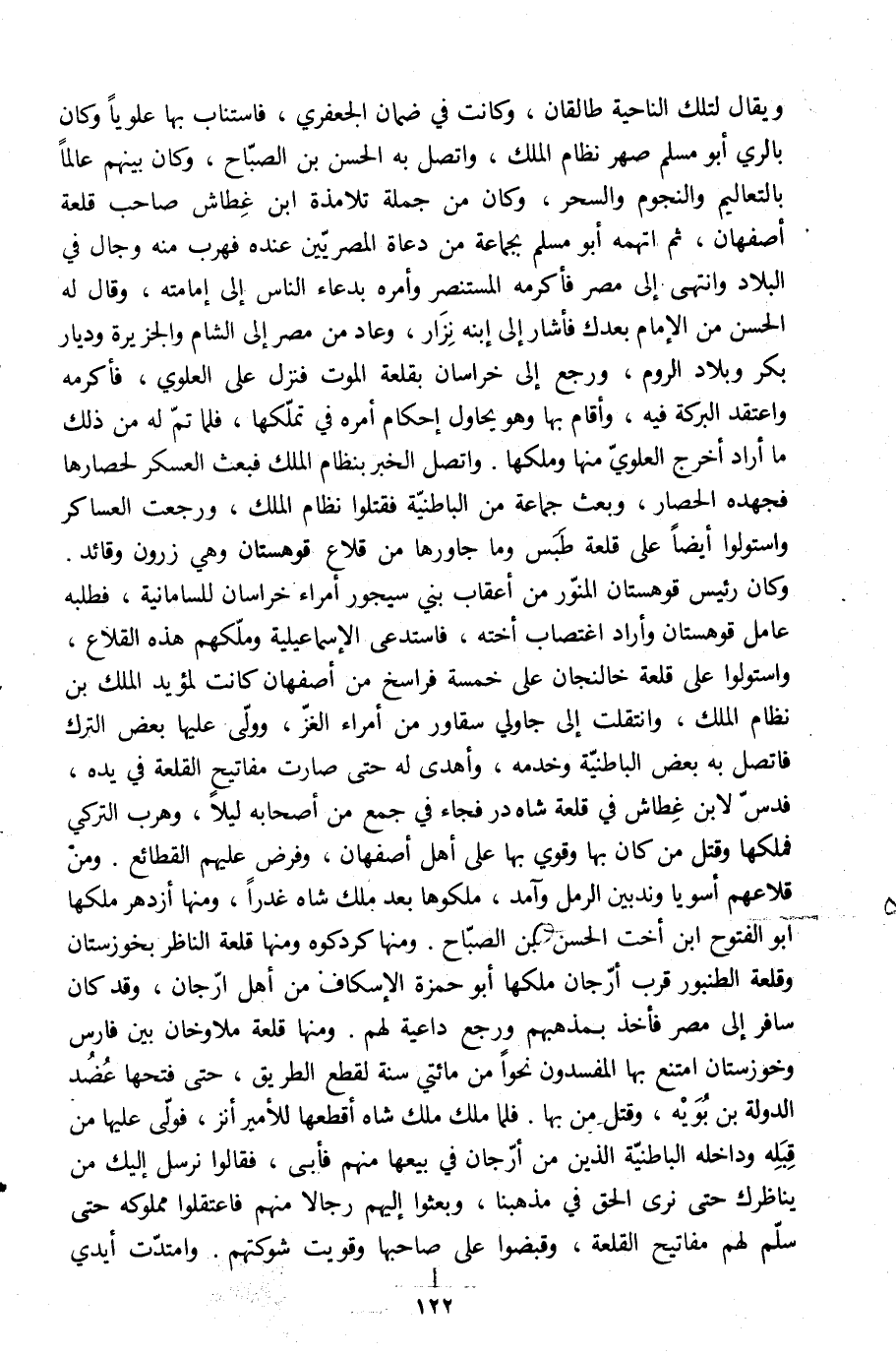 ويقال لتلك الناحية طالقان، وكانت في ضمان الجعفري، فاستناب بها علويا وكان بالري أبو مسلم صهر نظام الملك، واتصل به الحسن بن الصبّاح، وكان بينهم عالما بالتعاليم والنجوم والسحر، وكان من جملة تلامذة ابن غطاش صاحب قلعة أصفهان، ثم اتهمه أبو مسلم بجماعة من دعاة المصريّين عنده فهرب منه وجال في البلاد وانتهى إلى مصر فأكرمه المستنصر وأمره بدعاء الناس إلى إمامته، وقال له الحسن من الإمام بعدك فأشار إلى ابنه نزار، وعاد من مصر إلى الشام والجزيرة وديار بكر وبلاد الروم، ورجع إلى خراسان بقلعة الموت فنزل على العلويّ، فأكرمه واعتقد البركة فيه، وأقام بها وهو يحاول إحكام أمره في تملّكها، فلما تمّ له من ذلك ما أراد أخرج العلويّ منها وملكها. واتصل الخبر بنظام الملك فبعث العسكر لحصارها فجهده الحصار، وبعث جماعة من الباطنيّة فقتلوا نظام الملك، ورجعت العساكر واستولوا أيضا على قلعة طبس وما جاورها من قلاع قوهستان وهي زرون وقائد.