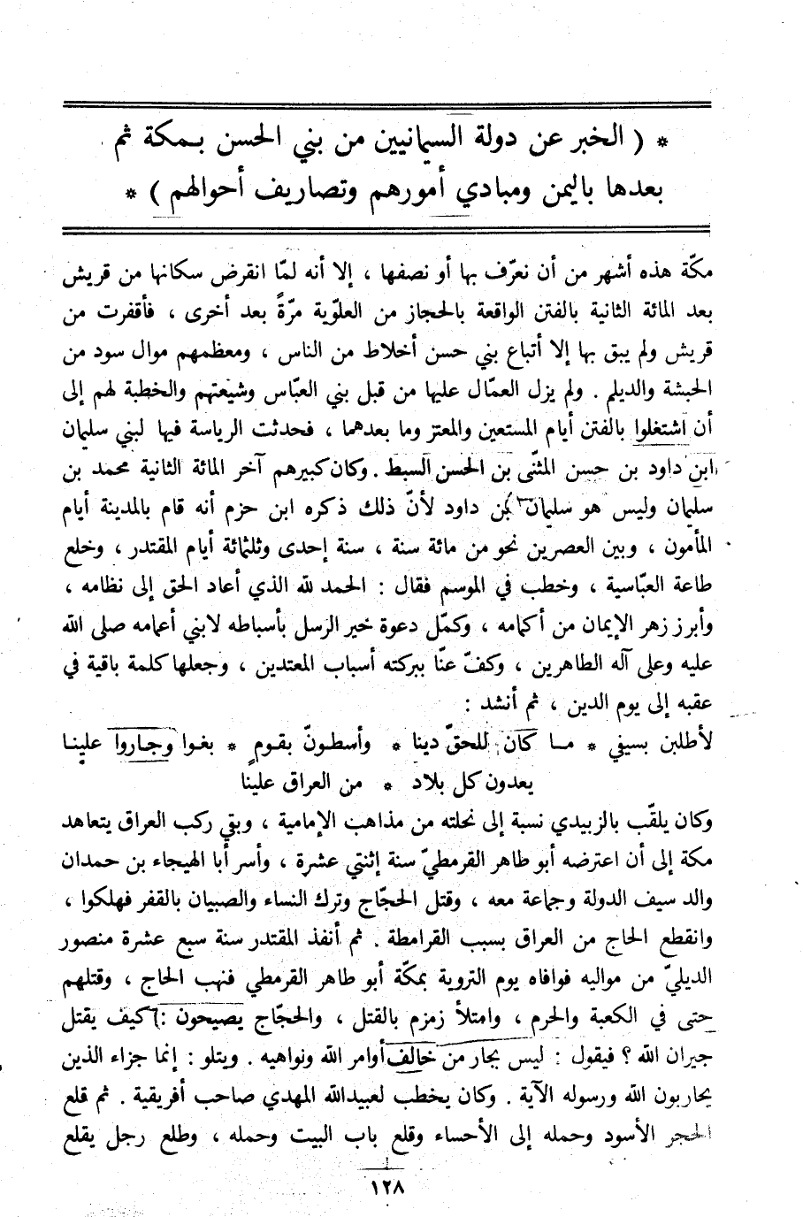 مكّة هذه أشهر من أن نعرّف بها أو نصفها، إلا أنه لمّا انقرض سكانها من قريش بعد المائة الثانية بالفتن الواقعة بالحجاز من العلويّة مرّة بعد أخرى، فأقفرت من قريش ولم يبق بها إلا أتباع بني حسن أخلاط من الناس، ومعظمهم موال سود من الحبشة والديلم. ولم يزل العمّال عليها من قبل بني العبّاس وشيعتهم والخطبة لهم إلى أن اشتغلوا بالفتن أيام المستعين والمعتز وما بعدهما، فحدثت الرئاسة فيها لبني سليمان ابن داود بن حسن المثنّى بن الحسن السبط. وكان كبيرهم آخر المائة الثانية محمد بن سليمان وليس هو سليمان بن داود لأنّ ذلك ذكره ابن حزم أنه قام بالمدينة أيام المأمون، وبين العصرين نحو من مائة سنة، سنة إحدى وثلاثمائة أيام المقتدر، وخلع طاعة العبّاسية، وخطب في الموسم فقال: الحمد للَّه الّذي أعاد الحق إلى نظامه، وأبرز زهر الإيمان من أكمامه، وكمّل دعوة خير الرسل بأسباطه لا بني أعمامه صلى الله عليه وعلى آله الطاهرين، وكفّ عنّا ببركته أسباب المعتدين، وجعلها كلمة باقية في عقبه إلى يوم الدين، ثم أنشد: