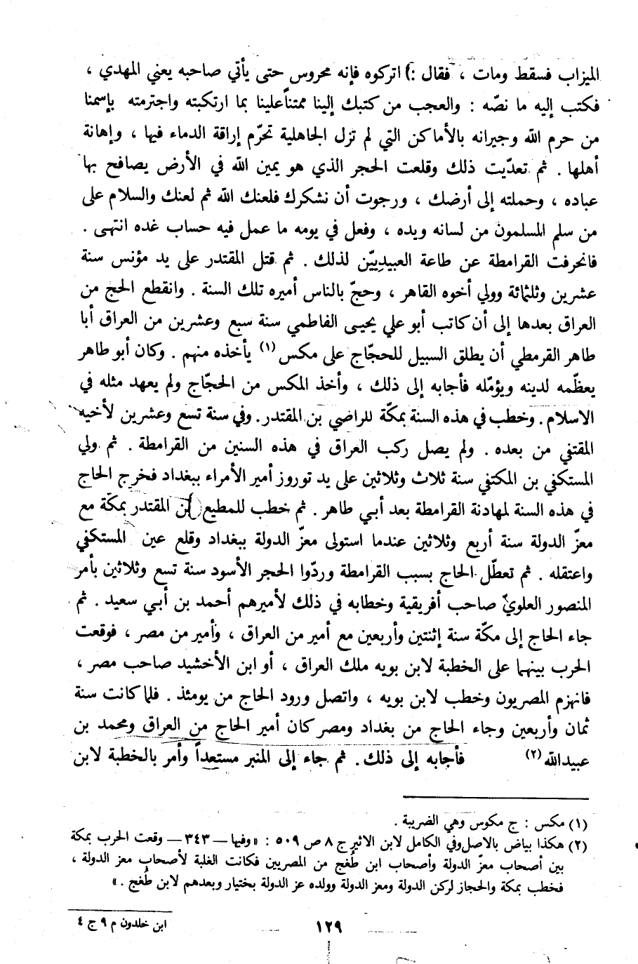 فانحرفت القرامطة عن طاعة العبيديّين لذلك. ثم قتل المقتدر على يد مؤنس سنة عشرين وثلاثمائة وولي أخوه القاهر، وحجّ بالناس أميره تلك السنة. وانقطع الحج من العراق بعدها إلى أن كاتب أبو علي يحيى الفاطمي سنة سبع وعشرين من العراق أبا طاهر القرمطي أن يطلق السبيل للحجّاج على مكس [1] يأخذه منهم. وكان أبو طاهر يعظّمه لدينه ويؤمّله فأجابه إلى ذلك، وأخذ المكس من الحجّاج ولم يعهد مثله في الإسلام. وخطب في هذه السنة بمكة للراضي بن المقتدر. وفي سنة تسع وعشرين لأخيه المقتفي من بعده. ولم يصل ركب العراق في هذه السنين من القرامطة. ثم ولي المستكفي بن المكتفي سنة ثلاث وثلاثين على يد توروز أمير الأمراء ببغداد فخرج الحاج في هذه السنة لمهادنة القرامطة بعد أبي طاهر. ثم خطب للمطيع بن المقتدر بمكّة مع معزّ الدولة سنة أربع وثلاثين عند ما استولى معزّ الدولة ببغداد وقلع عين المستكفي واعتقله. ثم تعطّل الحاج بسبب القرامطة وردّوا الحجر الأسود سنة تسع وثلاثين بأمر المنصور العلويّ صاحب إفريقية وخطابه في ذلك لأميرهم أحمد بن أبي سعيد. ثم جاء الحاج إلى مكّة سنة اثنتين وأربعين مع أمير من العراق، وأمير من مصر، فوقعت الحرب بينهما على الخطبة لابن بويه ملك العراق، أو ابن الإخشيد صاحب مصر، فانهزم المصريون وخطب لابن بويه، واتصل ورود الحاج من يومئذ. فلما كانت سنة ثمان وأربعين وجاء الحاج من بغداد ومصر كان أمير الحاج من العراق ومحمد بن عبيد الله [2] فأجابه إلى ذلك. ثم جاء إلى المنبر مستعدا وأمر بالخطبة لابن