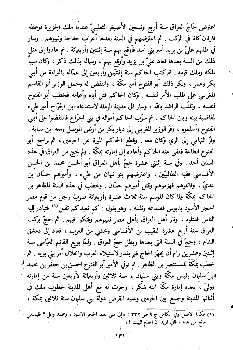 وفرّ التهامي إلى الري وكان معه. وقطع الحاكم الميرة عن الحرمين، ثم راجع أبو الفتوح الطاعة فعفا عنه الحاكم وأعاده إلى إمارته بمكّة. ولم يحج من العراق في هذه السنين أحد. وفي سنة اثنتي عشرة حجّ بأهل العراق أبو الحسن محمد بن الحسن الأفساسي فقيه الطالبيّين، واعترضهم بنو نبهان من طيِّئ، وأميرهم حسّان بن عديّ، وقاتلوهم فهزموهم وقتل أميرهم حسّان. وخطب في هذه السنة للظاهر بن الحاكم بمكّة ولما كان الموسم سنة ثلاث عشرة وأربعمائة ضرب رجل من قوم مصر الحجر الأسود بدبوس فصدعه وثلمه، وهو يقول: كم تعبد كم تقبل [1] فتبادر إليه الناس فقتلوه، وثار أهل العراق بأهل مصر فنهبوهم وفتكوا فيهم. ثم حجّ بركب العراق سنة أربع عشرة النقيب بن الأفساسي وخشي من العرب، فعاد إلى دمشق الشام، وحجّ في السنة التي بعدها وبطل حجّ العراق. ولمّا بويع القائم العبّاسي سنة اثنتين وعشرين رام أن يجهّز الحاج فلم يقدر لاستيلاء العرب وانحلال أمر بني بويه. ثم خطب بمكة للمستنصر بن الظاهر. ثم توفي الأمير أبو الفتوح الحسن بن جعفر بن محمد ابن سليمان رئيس مكّة وبني سليمان، سنة ثلاثين وأربعمائة لأربعين سنة من إمارته وولي، بعده إمارة مكّة ابنه شكر، وجرت له مع أهل المدينة خطوب ملك في أثنائها المدينة وجمع بين الحرمين وعليه انقرض دولة بني سليمان سنة ثلاثين بمكة،