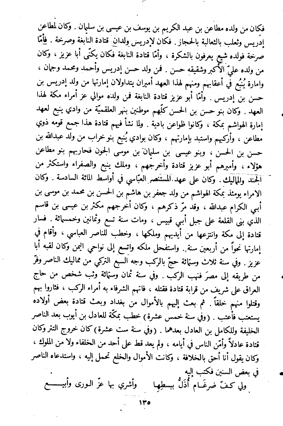 فكان من ولده مطاعن بن عبد الكريم بن يوسف بن عيسى بن سليمان. وكان لمطاعن إدريس وثعلب بالثعالبة بالحجاز. فكان لإدريس ولدان قتادة النابغة وصرخة. فأمّا صرخة فولده شيع يعرفون بالشكرة، وأمّا قتادة النابغة فكان يكنّى أبا عزيز، وكان من ولده عليّ الأكبر وشقيقه حسن. فمن ولد حسن إدريس وأحمد ومحمد وجمان، وامارة ينبع في أعقابهم ومنهم لهذا العهد أميران يتداولان إمارتها من ولد إدريس بن حسن بن إدريس. وأمّا أبو عزيز قتادة النابغة فمن ولده موالي عز أمراء مكة لهذا العهد. وكان بنو حسن بن الحسن كلّهم موطنين بنهر العلقميّة من وادي ينبع لعهد إمارة الهواشم بمكة، وكانوا ظواعن بادية. ولما نشأ فيهم قتادة هذا جمع قومه ذوي مطاعن، وأركبهم واستبد بإمارتهم، وكان بوادي ينبع بنو خراب من ولد عبد الله بن حسن بن الحسن، وبنو عيسى بن سليمان بن موسى الجون فحاربهم بنو مطاعن هؤلاء، وأميرهم أبو عزيز قتادة وأخرجهم، وملك ينبع والصفراء واستكثر من الجند والمماليك. وكان على عهد المستنصر العبّاسي في أواسط المائة السادسة. وكان الأمراء يومئذ بمكة الهواشم من ولد جعفر بن هاشم بن الحسن بن محمد بن موسى بن أبي الكرام عبد الله، وقد مرّ ذكرهم، وكان أخرجهم مكثر بن عيسى بن قاسم الّذي بنى القلعة على جبل أبي قبيس، ومات سنة تسع وثمانين وخمسمائة. فسار قتادة إلى مكة وانتزعها من أيديهم وملكها، وخطب للناصر العباسي، وأقام في إمارتها نحوا من أربعين سنة. واستفحل ملكه واتسع إلى نواحي اليمن وكان لقبه أبا عزيز. وفي سنة ثلاث وستمائة حجّ بالركب وجه السبع التركي من مماليك الناصر وفرّ من طريقه إلى مصر فنهب الركب. وفي سنة ثمان وستمائة وثب شخص من حاج العراق على شريف من قرابة قتادة فقتله، فاتهم الشرفاء به أمراء الركب، فثاروا بهم وقتلوا منهم خلقا. ثم بعث إليهم بالأموال من بغداد وبعث قتادة بعض أولاده يستعتب فأعتب. (وفي سنة خمس عشرة) خطب بمكّة للعادل بن أيوب بعد الناصر الخليفة وللكامل بن العادل بعدهما. (وفي سنة ست عشرة) كان خروج التتر وكان قتادة عادلا وأمّن الناس في أيامه، ولم يعد قط على أحد من الخلفاء ولا من الملوك، وكان يقول أنا أحق بالخلافة، وكانت الأموال والخلع تحمل إليه، واستدعاه الناصر في بعض السنين فكتب إليه