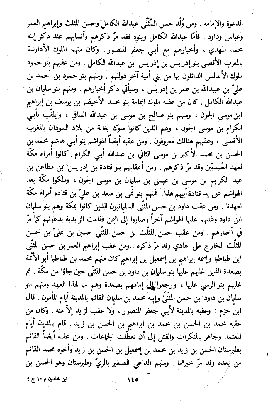 الدعوة والإمامة. ومن ولد حسن المثنّى عبد الله الكامل وحسن المثلث وإبراهيم العمر وعباس وداود. فأمّا عبد الله الكامل وبنوه فقد مرّ ذكرهم وأنسابهم عند ذكر ابنه محمد المهدي، وأخبارهم مع أبي جعفر المنصور. وكان منهم الملوك الأدارسة بالمغرب الأقصى بنو إدريس بن إدريس بن عبد الله الكامل. ومن عقبهم بنو حمود ملوك الأندلس الدائلون بها من بني أمية آخر دولتهم. ومنهم بنو حمود بن أحمد بن عليّ بن عبيد الله بن عمر بن إدريس، وسيأتي ذكر أخبارهم. ومنهم بنو سليمان بن عبد الله الكامل. كان من عقبه ملوك اليمامة بنو محمد الأخيضر بن يوسف بن إبراهيم ابن موسى الجون، ومنهم بنو صالح بن موسى بن عبد الله الساقي، ويلقّب بأبي الكرام بن موسى الجون، وهم الذين كانوا ملوكا بغانة من بلاد السودان بالمغرب الأقصى، وعقبهم لك معروفون. ومن عقبه أيضا الهواشم بنو أبي هاشم محمد بن الحسن بن محمد الأكبر بن موسى الثاني بن عبد الله أبي الكرام. كانوا أمراء مكّة لعهد العبيديّين وقد مرّ ذكرهم. ومن أعقابهم بنو قتادة بن إدريس بن مطاعن بن عبد الكريم بن موسى بن عيسى بن سليمان بن موسى الجون، وملكوا مكّة بعد الهواشم على يد قتادة أبيهم هذا. فمنهم بنو نمى بن سعد بن عليّ بن قتادة أمراء مكّة لعهدنا. ومن عقب داود بن حسن المثنّى السليمانيون الذين كانوا بمكة وهم بنو سليمان ابن داود وغلبهم عليها الهواشم آخرا وصاروا إلى اليمن فقامت الزيدية بدعوتهم كما مرّ في أخبارهم. ومن عقب حسن المثلّث بن حسن المثنّى حسين بن عليّ بن حسن المثلّث الخارج على الهادي وقد مرّ ذكره. ومن عقب إبراهيم العمر بن حسن المثنّى ابن طباطبا واسمه إبراهيم بن إسماعيل بن إبراهيم كان منهم محمد بن طباطبا أبو الأئمة بصعدة الذين غلبهم عليها بنو سليمان بن داود بن حسن المثنّى حين جاءوا من مكّة. ثم غلبهم بنو الرسي عليها، ورجعوا إلى إمامهم بصعدة وهم بها لهذا العهد ومنهم بنو سليمان بن داود بن حسن المثنّى وابنه محمد بن سليمان القائم بالمدينة أيام المأمون. قال ابن حزم: وعقبه بالمدينة لأبي جعفر المنصور، ولا عقب لزيد إلّا منه. وكان من عقبه محمد بن الحسن بن محمد بن إبراهيم بن الحسن بن زيد. قام بالمدينة أيام المعتمد وجاهر بالمنكرات والقتل إلى أن تعطّلت الجماعات. ومن عقبه أيضا القائم بطبرستان الحسن بن زيد بن محمد بن إسماعيل بن الحسن بن زيد وأخوه محمد القائم من بعده وقد مرّ خبرهما. ومنهم الداعي الصغير بالريّ وطبرستان وهو الحسن بن ابن خلدون م 10 ج 4