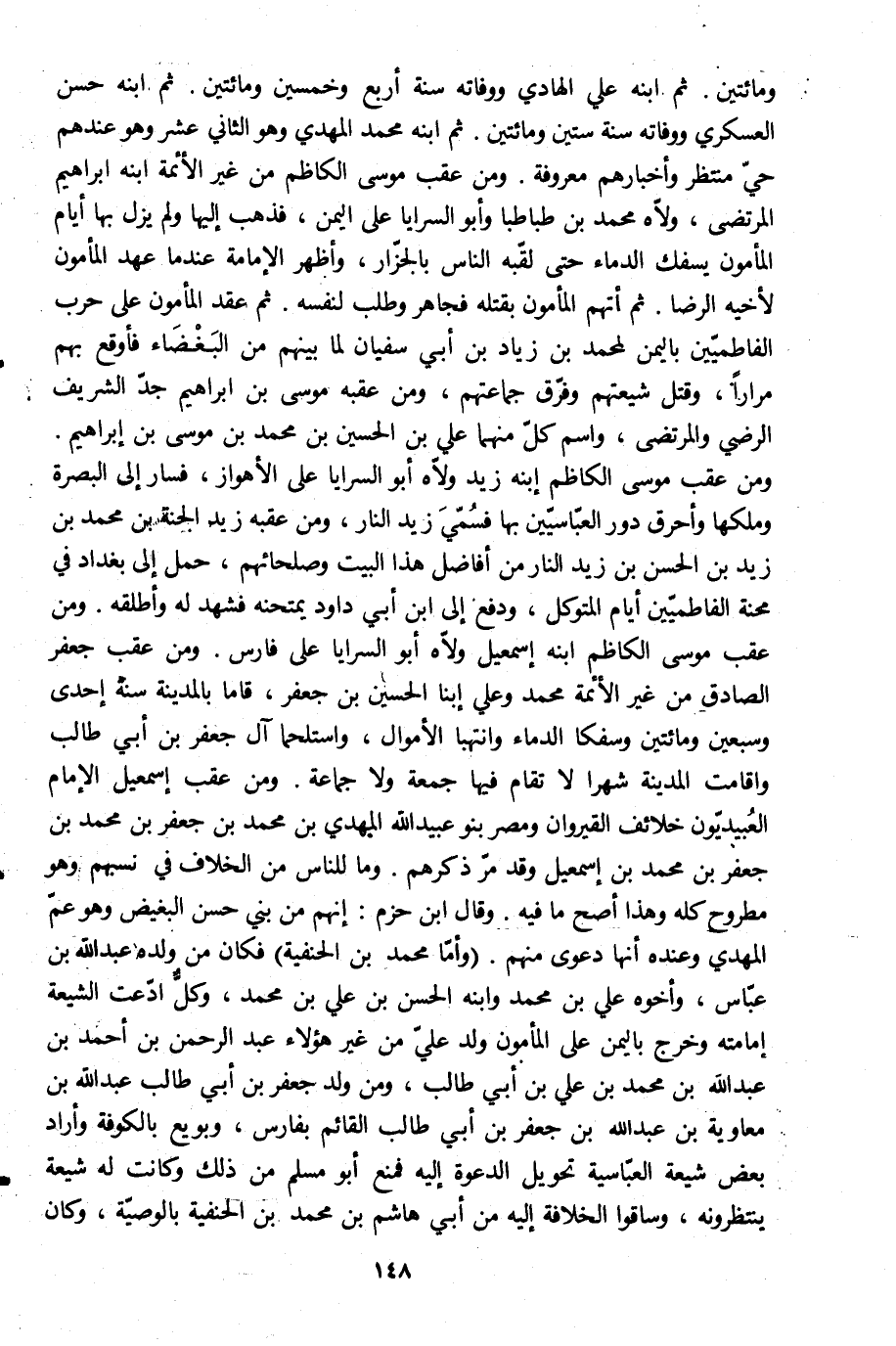 ومائتين. ثم ابنه علي الهادي ووفاته سنة أربع وخمسين ومائتين. ثم ابنه حسن العسكري ووفاته سنة ستين ومائتين. ثم ابنه محمد المهدي وهو الثاني عشر وهو عندهم حيّ منتظر وأخبارهم معروفة. ومن عقب موسى الكاظم من غير الأئمة ابنه إبراهيم المرتضى، ولّاه محمد بن طباطبا وأبو السرايا على اليمن، فذهب إليها ولم يزل بها أيام المأمون يسفك الدماء حتى لقّبه الناس بالجزّار، وأظهر الإمامة عند ما عهد المأمون لأخيه الرضا. ثم أتهم المأمون بقتله فجاهر وطلب لنفسه. ثم عقد المأمون على حرب الفاطميّين باليمن لمحمد بن زياد بن أبي سفيان لما بينهم من البغضاء فأوقع بهم مرارا، وقتل شيعتهم وفرّق جماعتهم، ومن عقبه موسى بن إبراهيم جدّ الشريف الرضي والمرتضى، واسم كلّ منهما علي بن الحسين بن محمد بن موسى بن إبراهيم.