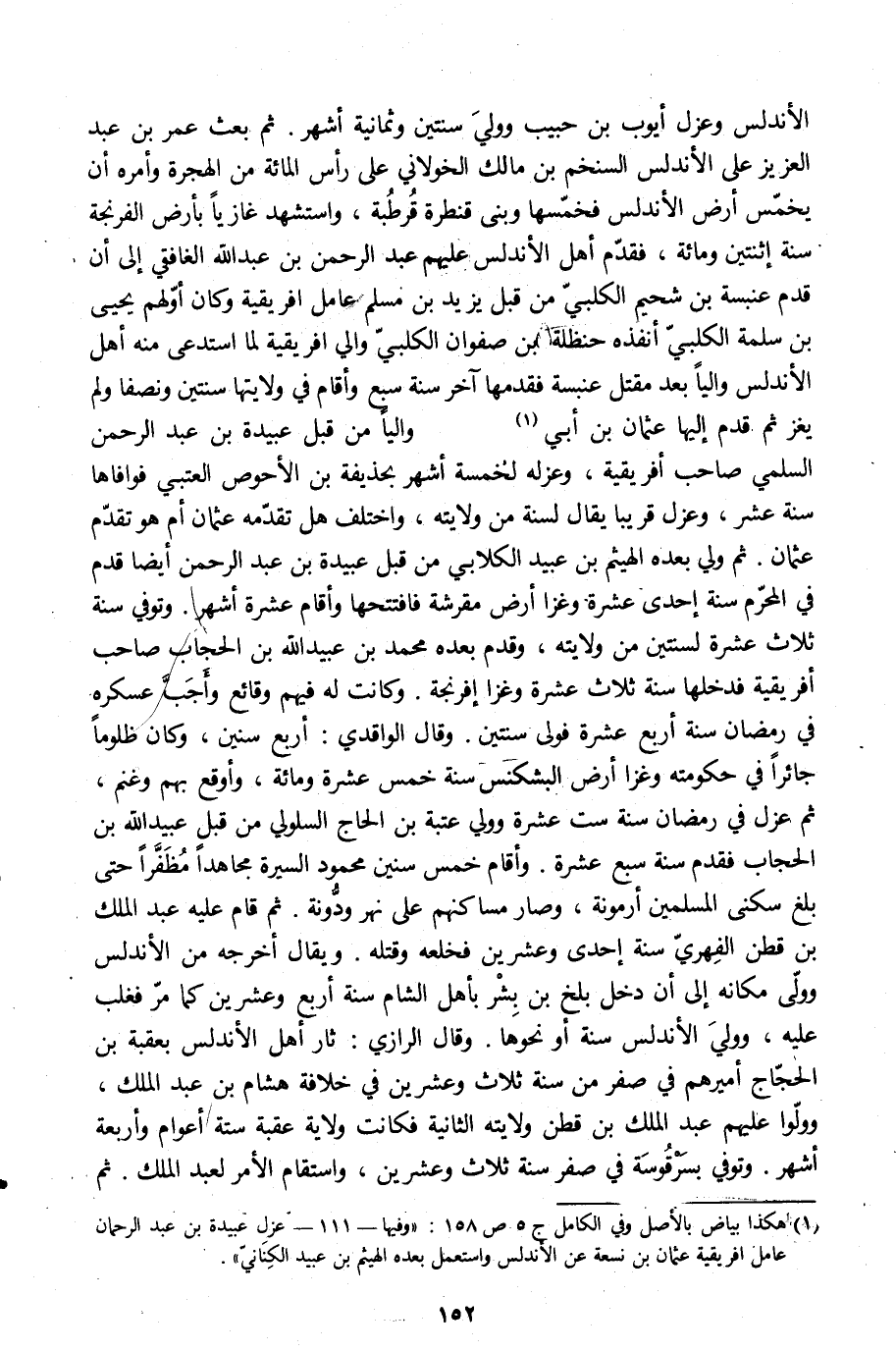 الأندلس وعزل أيوب بن حبيب وولي سنتين وثمانية أشهر. ثم بعث عمر بن عبد العزيز على الأندلس السنخم بن مالك الخولانيّ على رأس المائة من الهجرة وأمره أن يخمّس أرض الأندلس فخمّسها وبنى قنطرة قرطبة، واستشهد غازيا بأرض الفرنجة سنة اثنتين ومائة، فقدّم أهل الأندلس عليهم عبد الرحمن بن عبد الله الغافقي إلى أن قدم عنبسة بن شحيم الكلبيّ من قبل يزيد بن مسلم عامل افريقية وكان أوّلهم يحيى بن سلمة الكلبيّ أنفذه حنظلة بن صفوان الكلبيّ والي افريقية لما استدعى منه أهل الأندلس واليا بعد مقتل عنبسة فقدمها آخر سنة سبع وأقام في ولايتها سنتين ونصفا ولم يغز ثم قدم إليها عثمان بن أبي [1] واليا من قبل عبيدة بن عبد الرحمن السلمي صاحب إفريقية، وعزله لخمسة أشهر بحذيفة بن الأحوص العتبي فوافاها سنة عشر، وعزل قريبا يقال لسنة من ولايته، واختلف هل تقدّمه عثمان أم هو تقدّم عثمان. ثم ولي بعده الهيثم بن عبيد الكلابي من قبل عبيدة بن عبد الرحمن أيضا قدم في المحرّم سنة إحدى عشرة وغزا أرض مقرشة فافتتحها وأقام عشرة أشهر. وتوفي سنة ثلاث عشرة لسنتين من ولايته، وقدم بعده محمد بن عبيد الله بن الحجاب صاحب إفريقية فدخلها سنة ثلاث عشرة وغزا إفرنجة. وكانت له فيهم وقائع وأجبّ عسكره في رمضان سنة أربع عشرة فولى سنتين. وقال الواقدي: أربع سنين، وكان ظلوما جائرا في حكومته وغزا أرض البشكنس سنة خمس عشرة ومائة، وأوقع بهم وغنم، ثم عزل في رمضان سنة ست عشرة وولي عتبة بن الحاج السلولي من قبل عبيد الله بن الحجاب فقدم سنة سبع عشرة. وأقام خمس سنين محمود السيرة مجاهدا مظفّرا حتى بلغ سكنى المسلمين أرمونة، وصار مساكنهم على نهر ودّونة. ثم قام عليه عبد الملك بن قطن الفهريّ سنة إحدى وعشرين فخلعه وقتله. ويقال أخرجه من الأندلس وولّى مكانه إلى أن دخل بلخ بن بشر بأهل الشام سنة أربع وعشرين كما مرّ فغلب عليه، وولي الأندلس سنة أو نحوها. وقال الرازيّ: ثار أهل الأندلس بعقبة بن الحجّاج أميرهم في صفر من سنة ثلاث وعشرين في خلافة هشام بن عبد الملك، وولّوا عليهم عبد الملك بن قطن ولايته الثانية فكانت ولاية عقبة ستة أعوام وأربعة أشهر. وتوفي بسرقوسة في صفر سنة ثلاث وعشرين، واستقام الأمر لعبد الملك. ثم