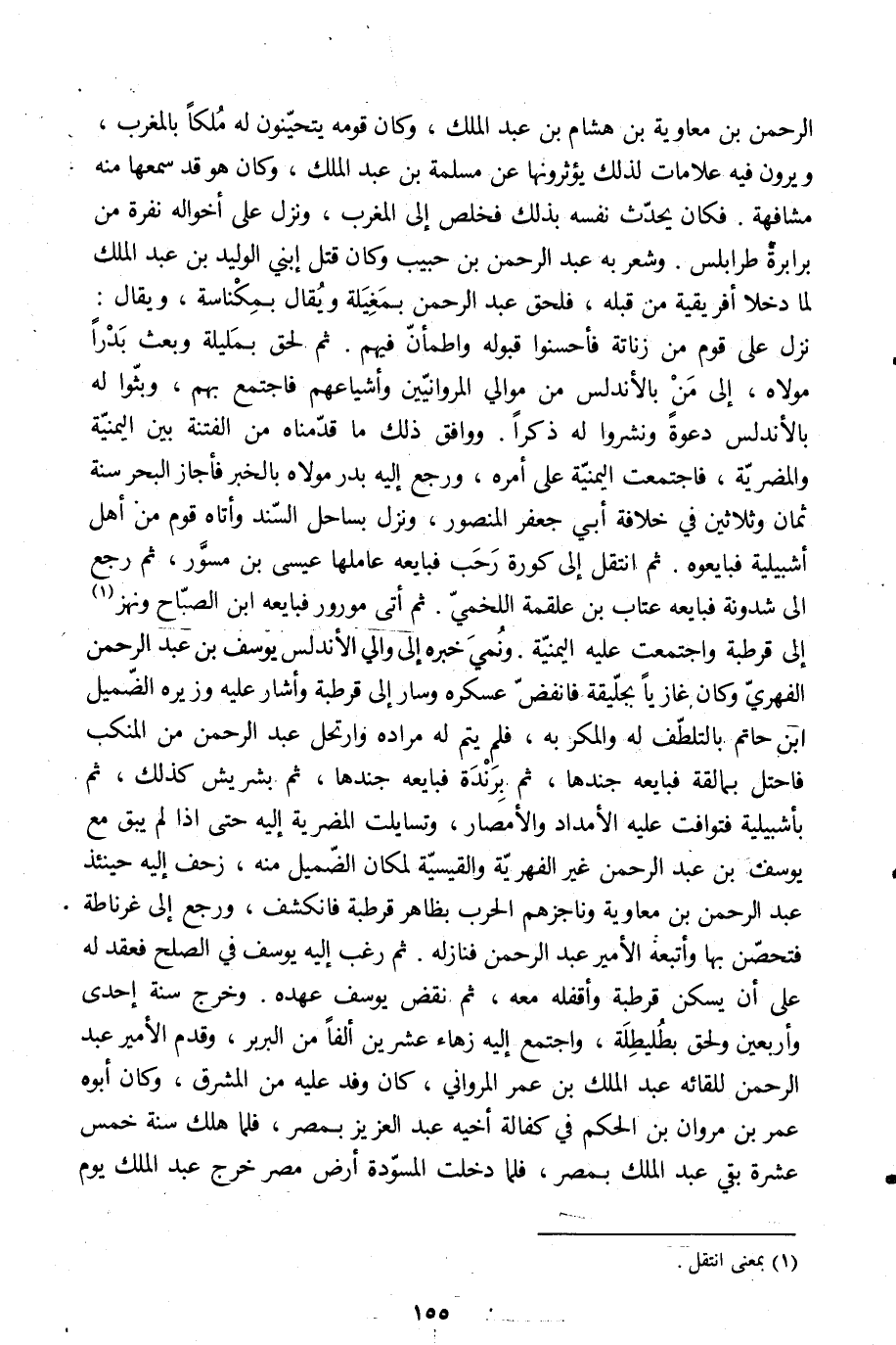 نزل على قوم من زناتة فأحسنوا قبوله واطمأنّ فيهم. ثم لحق بمليلة وبعث بدرا مولاه، إلى من بالأندلس من موالي المروانيّين وأشياعهم فاجتمع بهم، وبثّوا له بالأندلس دعوة ونشروا له ذكرا. ووافق ذلك ما قدّمناه من الفتنة بين اليمنيّة والمضريّة، فاجتمعت اليمنيّة على أمره، ورجع إليه بدر مولاه بالخبر فأجاز البحر سنة ثمان وثلاثين في خلافة أبي جعفر المنصور، ونزل بساحل السّند وأتاه قوم من أهل إشبيليّة فبايعوه. ثم انتقل إلى كورة رحب فبايعه عاملها عيسى بن مسوّر، ثم رجع الى شدونة فبايعه عتاب بن علقمة اللخميّ. ثم أتى مورور فبايعه ابن الصبّاح ونهز [1] إلى قرطبة واجتمعت عليه اليمنيّة. ونمي خبره إلى والي الأندلس يوسف بن عبد الرحمن الفهريّ وكان غازيا بجلّيقة فانفضّ عسكره وسار إلى قرطبة وأشار عليه وزيره الضّميل ابن حاتم بالتلطّف له والمكر به، فلم يتم له مراده وارتحل عبد الرحمن من المنكب فاحتل بمالقة فبايعه جندها، ثم برندة فبايعه جندها، ثم بشريش كذلك، ثم بأشبيليّة فتوافت عليه الأمداد والأمصار، وتسايلت المضرية إليه حتى إذا لم يبق مع يوسف بن عبد الرحمن غير الفهريّة والقيسيّة لمكان الضّميل منه، زحف إليه حينئذ عبد الرحمن بن معاوية وناجزهم الحرب بظاهر قرطبة فانكشف، ورجع إلى غرناطة فتحصّن بها وأتبعه الأمير عبد الرحمن فنازله. ثم رغب إليه يوسف في الصلح فعقد له على أن يسكن قرطبة وأقفله معه، ثم نقض يوسف عهده. وخرج سنة إحدى وأربعين ولحق بطليطلة، واجتمع إليه زهاء عشرين ألفا من البربر، وقدم الأمير عبد الرحمن للقائه عبد الملك بن عمر المرواني، كان وفد عليه من المشرق، وكان أبوه عمر بن مروان بن الحكم في كفالة أخيه عبد العزيز بمصر، فلما هلك سنة خمس عشرة بقي عبد الملك بمصر، فلما دخلت المسوّدة أرض مصر خرج عبد الملك يوم