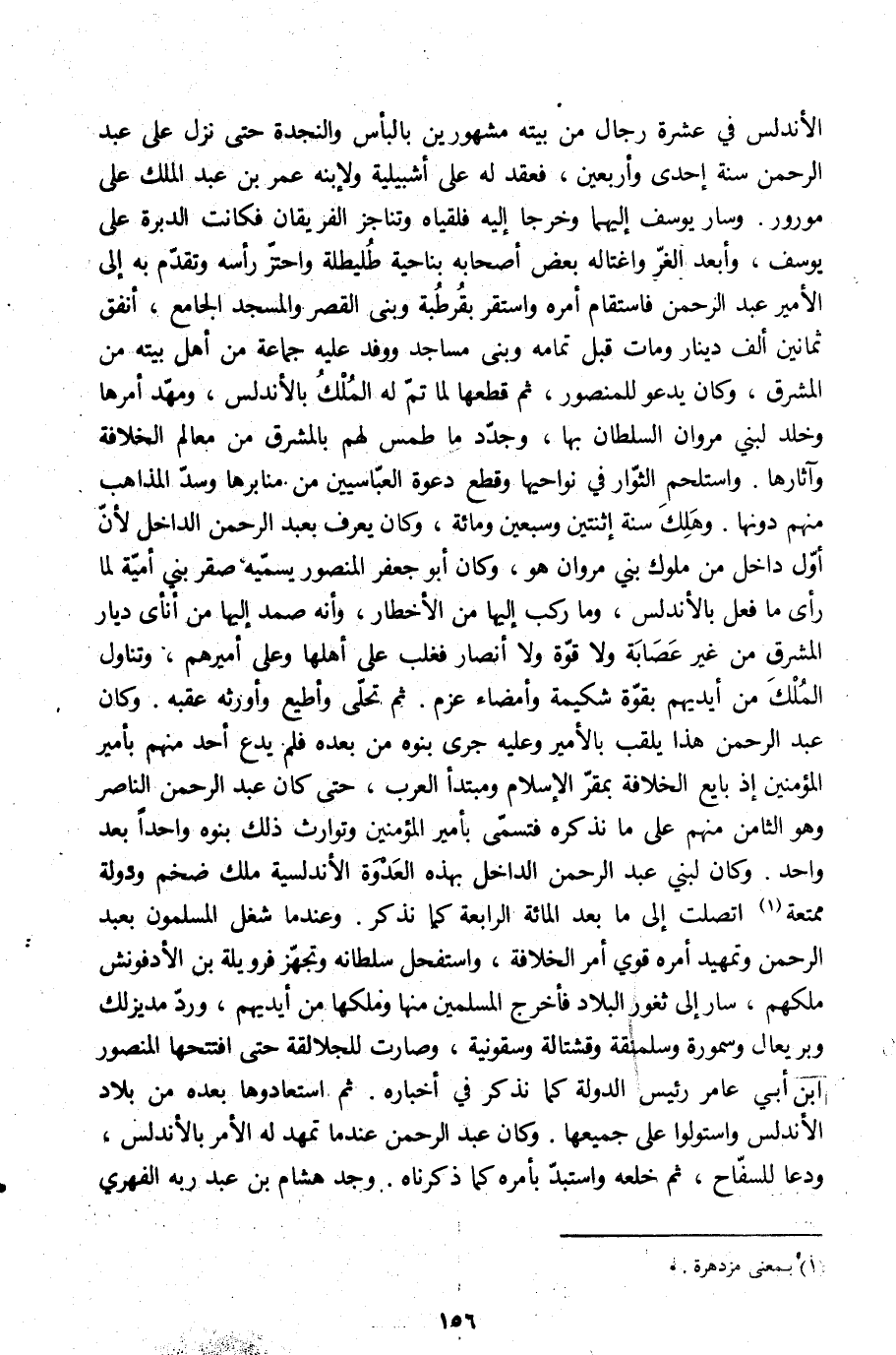 الأندلس في عشرة رجال من بيته مشهورين بالبأس والنجدة حتى نزل على عبد الرحمن سنة إحدى وأربعين، فعقد له على إشبيليّة ولابنه عمر بن عبد الملك على مورور. وسار يوسف إليهما وخرجا إليه فلقياه وتناجز الفريقان فكانت الدبرة على يوسف، وأبعد الغرّ واغتاله بعض أصحابه بناحية طليطلة واحتزّ رأسه وتقدّم به إلى الأمير عبد الرحمن فاستقام أمره واستقر بقرطبة وبنى القصر والمسجد الجامع، أنفق ثمانين ألف دينار ومات قبل تمامه وبنى مساجد ووفد عليه جماعة من أهل بيته من المشرق، وكان يدعو للمنصور، ثم قطعها لما تمّ له الملك بالأندلس، ومهّد أمرها وخلد لبني مروان السلطان بها، وجدّد ما طمس لهم بالمشرق من معالم الخلافة وآثارها. واستلحم الثّوار في نواحيها وقطع دعوة العبّاسيين من منابرها وسدّ المذاهب منهم دونها. وهلك سنة اثنتين وسبعين ومائة، وكان يعرف بعبد الرحمن الداخل لأنّ أوّل داخل من ملوك بني مروان هو، وكان أبو جعفر المنصور يسمّيه صقر بني أميّة لما رأى ما فعل بالأندلس، وما ركب إليها من الأخطار، وأنه صمد إليها من أنأى ديار المشرق من غير عصابة ولا قوّة ولا أنصار فغلب على أهلها وعلى أميرهم، وتناول الملك من أيديهم بقوّة شكيمة وإمضاء عزم. ثم تحلّى وأطيع وأورثه عقبه. وكان عبد الرحمن هذا يلقب بالأمير وعليه جرى بنوه من بعده فلم يدع أحد منهم بأمير المؤمنين إذ بايع الخلافة بمقرّ الإسلام ومبتدأ العرب، حتى كان عبد الرحمن الناصر وهو الثامن منهم على ما نذكره فتسمّى بأمير المؤمنين وتوارث ذلك بنوه واحدا بعد واحد. وكان لبني عبد الرحمن الداخل بهذه العدوة الأندلسية ملك ضخم ودولة ممتعة [1] اتصلت إلى ما بعد المائة الرابعة كما نذكر. وعند ما شغل المسلمون بعبد الرحمن وتمهيد أمره قوي أمر الخلافة، واستفحل سلطانه وتجهّز فرويلة بن الأدفونش ملكهم، سار إلى ثغور البلاد فأخرج المسلمين منها وملكها من أيديهم، وردّ مديزلك وبريعال وسمورة وسلمنقة وقشتالة وسقونية، وصارت للجلالقة حتى افتتحها المنصور ابن أبي عامر رئيس الدولة كما نذكر في أخباره. ثم استعادوها بعده من بلاد الأندلس واستولوا على جميعها. وكان عبد الرحمن عند ما تمهد له الأمر بالأندلس، ودعا للسفّاح، ثم خلعه واستبدّ بأمره كما ذكرناه. وجد هشام بن عبد ربه الفهري