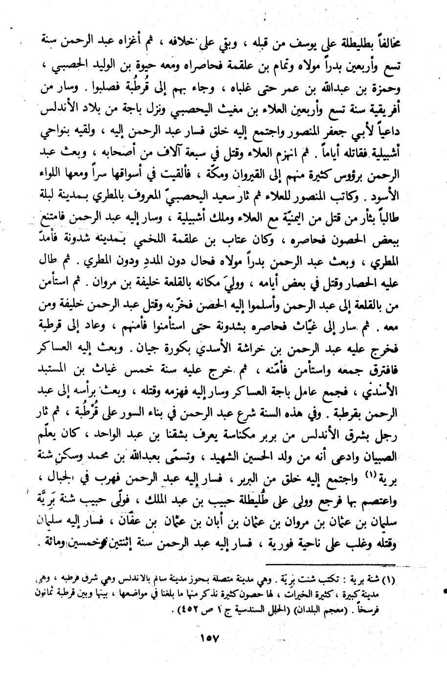 مخالفا بطليطلة على يوسف من قبله، وبقي على خلافه، ثم أغزاه عبد الرحمن سنة تسع وأربعين بدرا مولاه وتمام بن علقمة فحاصراه ومعه حيوة بن الوليد الحصبي، وحمزة بن عبد الله بن عمر حتى غلباه، وجاء بهم إلى قرطبة فصلبوا. وسار من إفريقية سنة تسع وأربعين العلاء بن مغيث اليحصبي ونزل باجة من بلاد الأندلس داعيا لأبي جعفر المنصور واجتمع إليه خلق فسار عبد الرحمن إليه، ولقيه بنواحي إشبيليّة فقاتله أياما. ثم انهزم العلاء وقتل في سبعة آلاف من أصحابه، وبعث عبد الرحمن برءوس كثيرة منهم إلى القيروان ومكّة، فألقيت في أسواقها سرا ومعها اللواء الأسود. وكاتب المنصور للعلاء ثم ثار سعيد اليحصبيّ المعروف بالمطري بمدينة لبلة طالبا بثأر من قتل من اليمنيّة مع العلاء وملك إشبيليّة، وسار إليه عبد الرحمن فامتنع ببعض الحصون فحاصره، وكان عتاب بن علقمة اللخمي بمدينة شدونة فأمدّ المطري، وبعث عبد الرحمن بدرا مولاه فحال دون المدد ودون المطري. ثم طال عليه الحصار وقتل في بعض أيامه، وولي مكانه بالقلعة خليفة بن مروان. ثم استأمن من بالقلعة إلى عبد الرحمن وأسلموا إليه الحصن فخرّبه وقتل عبد الرحمن خليفة ومن معه. ثم سار إلى غيّاث فحاصره بشدونة حتى استأمنوا فأمنهم، وعاد إلى قرطبة فخرج عليه عبد الرحمن بن خراشة الأسدي بكورة جيان. وبعث إليه العساكر فافترق جمعه واستأمن فأمّنه، ثم خرج عليه سنة خمس غياث بن المستبد الاسديّ، فجمع عامل باجة العساكر وسار إليه فهزمه وقتله، وبعث برأسه إلى عبد الرحمن بقرطبة. وفي هذه السنة شرع عبد الرحمن في بناء السور على قرطبة، ثم ثار رجل بشرق الأندلس من بربر مكناسة يعرف بشقنا بن عبد الواحد، كان يعلّم الصبيان وادعى أنه من ولد الحسين الشهيد، وتسمّى بعبد الله بن محمد وسكن شنة برية [1] واجتمع إليه خلق من البربر، فسار إليه عبد الرحمن فهرب في الجبال، واعتصم بها فرجع وولى على طليطلة حبيب بن عبد الملك، فولّى حبيب شنة بريّة سليمان بن عثمان بن مروان بن عثمان بن أبان بن عثمان بن عفّان، فسار إليه سليمان وقتله وغلب على ناحية فورية، فسار إليه عبد الرحمن سنة اثنتين وخمسين ومائة.