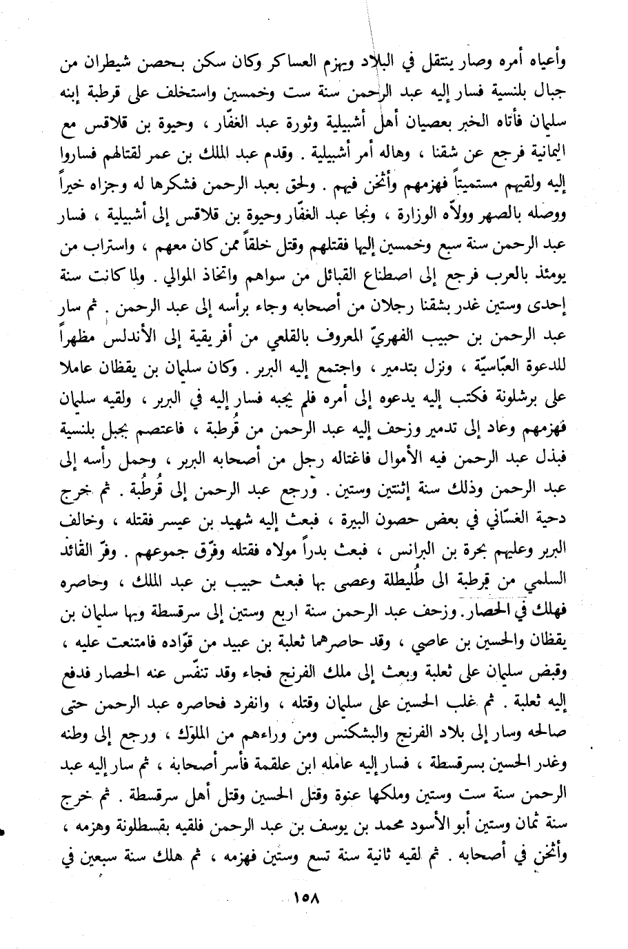 وأعياه أمره وصار ينتقل في البلاد ويهزم العساكر وكان سكن بحصن شيطران من جبال بلنسية فسار إليه عبد الرحمن سنة ست وخمسين واستخلف على قرطبة ابنه سليمان فأتاه الخبر بعصيان أهل إشبيليّة وثورة عبد الغفّار، وحيوة بن قلاقس مع اليمانية فرجع عن شقنا، وهاله أمر إشبيليّة. وقدم عبد الملك بن عمر لقتالهم فساروا إليه ولقيهم مستميتا فهزمهم وأثخن فيهم. ولحق بعبد الرحمن فشكرها له وجزاه خيرا ووصله بالصهر وولّاه الوزارة، ونجا عبد الغفّار وحيوة بن قلاقس إلى إشبيليّة، فسار عبد الرحمن سنة سبع وخمسين إليها فقتلهم وقتل خلقا ممن كان معهم، واستراب من يومئذ بالعرب فرجع إلى اصطناع القبائل من سواهم واتخاذ الموالي. ولما كانت سنة إحدى وستين غدر بشقنا رجلان من أصحابه وجاء برأسه إلى عبد الرحمن. ثم سار عبد الرحمن بن حبيب الفهريّ المعروف بالقلعي من إفريقية إلى الأندلس مظهرا للدعوة العبّاسيّة، ونزل بتدمير، واجتمع إليه البربر. وكان سليمان بن يقظان عاملا على برشلونة فكتب إليه يدعوه إلى أمره فلم يجبه فسار إليه في البربر، ولقيه سليمان فهزمهم وعاد إلى تدمير وزحف إليه عبد الرحمن من قرطبة، فاعتصم بجبل بلنسية فبذل عبد الرحمن فيه الأموال فاغتاله رجل من أصحابه البربر، وحمل رأسه إلى عبد الرحمن وذلك سنة اثنتين وستين. ورجع عبد الرحمن إلى قرطبة. ثم خرج دحية الغسّاني في بعض حصون البيرة، فبعث إليه شهيد بن عيسر فقتله، وخالف البربر وعليهم بحرة بن البرانس، فبعث بدرا مولاه فقتله وفرّق جموعهم. وفرّ القائد السلمي من قرطبة الى طليطلة وعصى بها فبعث حبيب بن عبد الملك، وحاصره فهلك في الحصار. وزحف عبد الرحمن سنة اربع وستين إلى سرقسطة وبها سليمان بن يقظان والحسين بن عاصي، وقد حاصرهما ثعلبة بن عبيد من قوّاده فامتنعت عليه، وقبض سليمان على ثعلبة وبعث إلى ملك الفرنج فجاء وقد تنفّس عنه الحصار فدفع إليه ثعلبة. ثم غلب الحسين على سليمان وقتله، وانفرد فحاصره عبد الرحمن حتى صالحه وسار إلى بلاد الفرنج والبشكنس ومن وراءهم من الملوك، ورجع إلى وطنه وغدر الحسين بسرقسطة، فسار إليه عامله ابن علقمة فأسر أصحابه، ثم سار إليه عبد الرحمن سنة ست وستين وملكها عنوة وقتل الحسين وقتل أهل سرقسطة. ثم خرج سنة ثمان وستين أبو الأسود محمد بن يوسف بن عبد الرحمن فلقيه بقسطلونة وهزمه، وأثخن في أصحابه. ثم لقيه ثانية سنة تسع وستين فهزمه، ثم هلك سنة سبعين في
