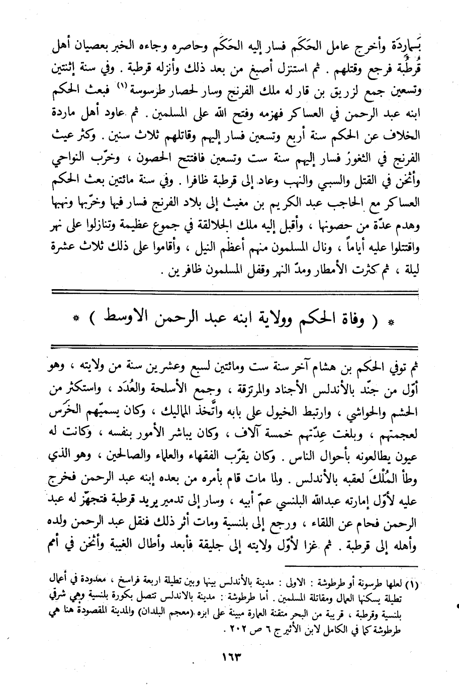 بماردة وأخرج عامل الحكم فسار إليه الحكم وحاصره وجاءه الخبر بعصيان أهل قرطبة فرجع وقتلهم. ثم استنزل أصبغ من بعد ذلك وأنزله قرطبة. وفي سنة اثنتين وتسعين جمع لزريق بن قار له ملك الفرنج وسار لحصار طرسوسة [1] فبعث الحكم ابنه عبد الرحمن في العساكر فهزمه وفتح الله على المسلمين. ثم عاود أهل ماردة الخلاف عن الحكم سنة أربع وتسعين فسار إليهم وقاتلهم ثلاث سنين. وكثر عيث الفرنج في الثغور فسار إليهم سنة ست وتسعين فافتتح الحصون، وخرّب النواحي وأثخن في القتل والسبي والنهب وعاد إلى قرطبة ظافرا. وفي سنة مائتين بعث الحكم العساكر مع الحاجب عبد الكريم بن مغيث إلى بلاد الفرنج فسار فيها وخرّبها ونهبها وهدم عدّة من حصونها، وأقبل إليه ملك الجلالقة في جموع عظيمة وتنازلوا على نهر واقتتلوا عليه أياما، ونال المسلمون منهم أعظم النيل، وأقاموا على ذلك ثلاث عشرة ليلة، ثم كثرت الأمطار ومدّ النهر وقفل المسلمون ظافرين.
