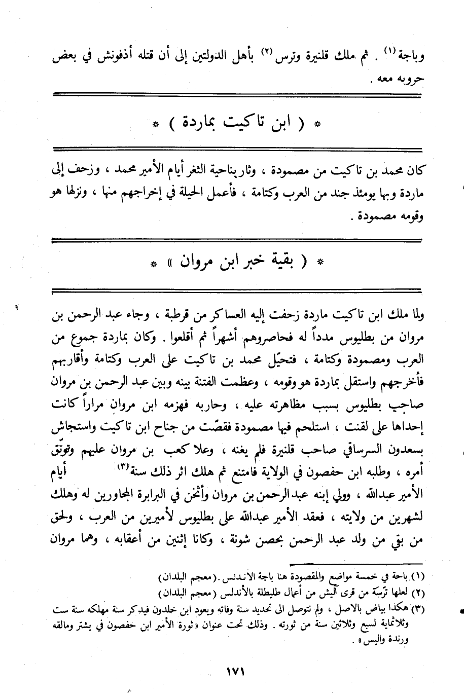 ولما ملك ابن تاكيت ماردة زحفت إليه العساكر من قرطبة، وجاء عبد الرحمن بن مروان من بطليوس مددا له فحاصروهم أشهرا ثم أقلعوا. وكان بماردة جموع من العرب ومصمودة وكتامة، فتحيّل محمد بن تاكيت على العرب وكتامة وأقاربهم فأخرجهم واستقل بماردة هو وقومه، وعظمت الفتنة بينه وبين عبد الرحمن بن مروان صاحب بطليوس بسبب مظاهرته عليه، وحاربه فهزمه ابن مروان مرارا كانت إحداها على لقنت، استلحم فيها مصمودة فقصّت من جناح ابن تاكيت واستجاش بسعدون السرساقي صاحب قلنيرة فلم يغنه، وعلا كعب بن مروان عليهم وتوتّق أمره، وطلبه ابن حفصون في الولاية فامتنع ثم هلك اثر ذلك سنة [3] أيام الأمير عبد الله، وولي ابنه عبد الرحمن بن مروان وأثخن في البرابرة المجاورين له وهلك لشهرين من ولايته، فعقد الأمير عبد الله على بطليوس لأميرين من العرب، ولحق من بقي من ولد عبد الرحمن بحصن شونة، وكانا اثنين من أعقابه، وهما مروان