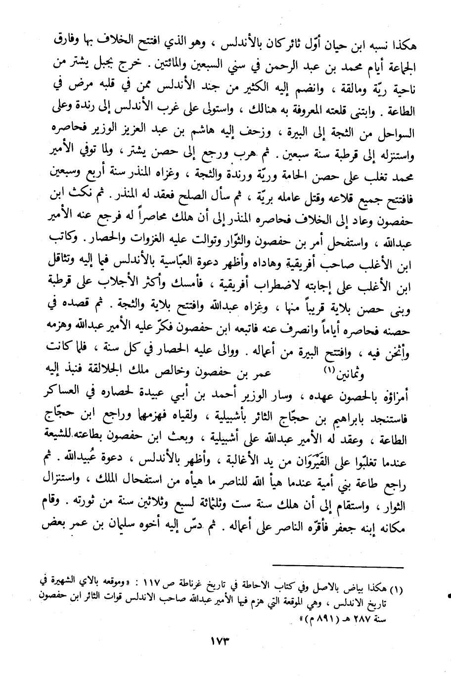 [1] هكذا بياض بالأصل وفي كتاب الاحاطة في تاريخ غرناطة ص 117: «وموقعه بالاي الشهيرة في تاريخ الأندلس، وهي الموقعة التي هزم فيها الأمير عبد الله صاحب الأندلس قوات الثائر ابن حفصون سنة 287 هـ (891 م) »