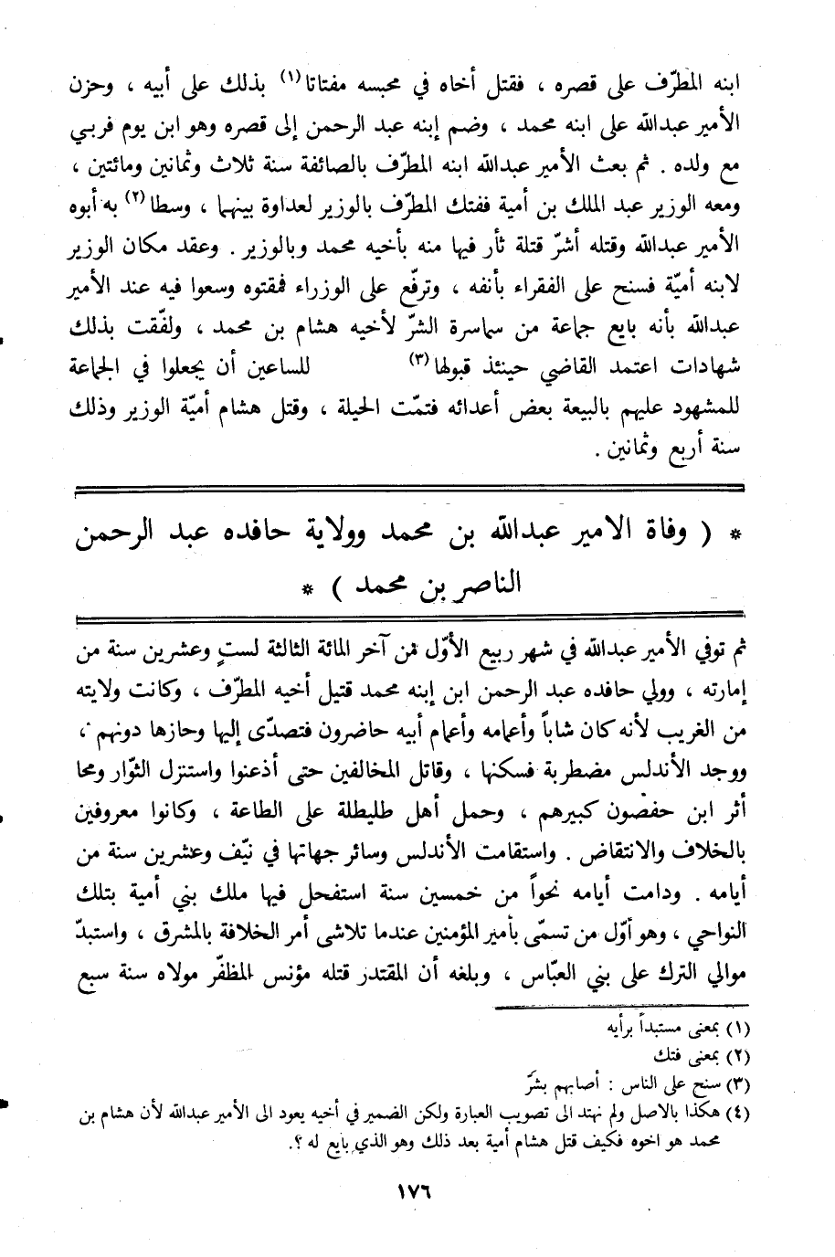 ابنه المطرّف على قصره، فقتل أخاه في محبسه مفتاتا [1] بذلك على أبيه، وحزن الأمير عبد الله على ابنه محمد، وضم ابنه عبد الرحمن إلى قصره وهو ابن يوم فربي مع ولده. ثم بعث الأمير عبد الله ابنه المطرّف بالصائفة سنة ثلاث وثمانين ومائتين، ومعه الوزير عبد الملك بن أمية ففتك المطرّف بالوزير لعداوة بينهما، وسطا [2] به أبوه الأمير عبد الله وقتله أشرّ قتله ثأر فيها منه بأخيه محمد وبالوزير. وعقد مكان الوزير لابنه أميّة فسنح على الفقراء [3] بأنفه، وترفّع على الوزراء فمقتوه وسعوا فيه عند الأمير عبد الله بأنه بايع جماعة من سماسرة الشرّ لأخيه هشام بن محمد، ولفّقت بذلك شهادات اعتمد القاضي حينئذ قبولها [4] للساعين أن يجعلوا في الجماعة للمشهود عليهم بالبيعة بعض أعدائه فتمّت الحيلة، وقتل هشام أميّة الوزير وذلك سنة أربع وثمانين.