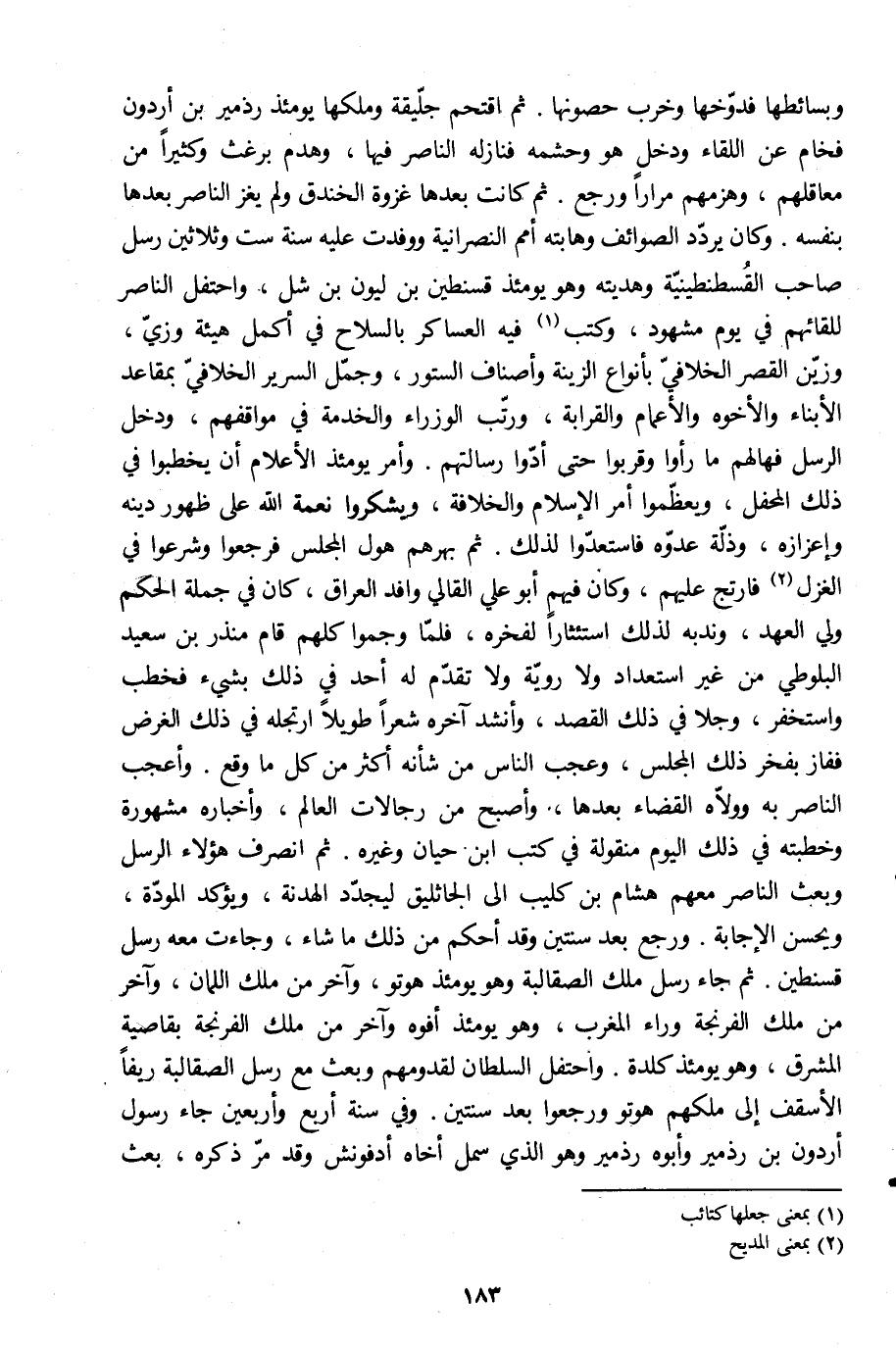 وبسائطها فدوّخها وخرب حصونها. ثم اقتحم جلّيقة وملكها يومئذ رذمير بن أردون فخام عن اللقاء ودخل هو وحشمه فنازله الناصر فيها، وهدم برغث وكثيرا من معاقلهم، وهزمهم مرارا ورجع. ثم كانت بعدها غزوة الخندق ولم يغز الناصر بعدها بنفسه. وكان يردّد الصوائف وهابته أمم النصرانية ووفدت عليه سنة ست وثلاثين رسل صاحب القسطنطينيّة وهديته وهو يومئذ قسنطين بن ليون بن شل، واحتفل الناصر للقائهم في يوم مشهود، وكتب [1] فيه العساكر بالسلاح في أكمل هيئة وزيّ، وزيّن القصر الخلافيّ بأنواع الزينة وأصناف الستور، وجمّل السرير الخلافيّ بمقاعد الأبناء والإخوة والأعمام والقرابة، ورتّب الوزراء والخدمة في مواقفهم، ودخل الرسل فهالهم ما رأوا وقربوا حتى أدّوا رسالتهم. وأمر يومئذ الأعلام أن يخطبوا في ذلك المحفل، ويعظّموا أمر الإسلام والخلافة، ويشكروا نعمة الله على ظهور دينه وإعزازه، وذلّة عدوّه فاستعدّوا لذلك. ثم بهرهم هول المجلس فرجعوا وشرعوا في الغزل [2] فارتج عليهم، وكان فيهم أبو علي القالي وافد العراق، كان في جملة الحكم ولي العهد، وندبه لذلك استئثارا لفخره، فلمّا وجموا كلهم قام منذر بن سعيد البلوطي من غير استعداد ولا رويّة ولا تقدّم له أحد في ذلك بشيء فخطب واستخفر، وجلا في ذلك القصد، وأنشد آخره شعرا طويلا ارتجله في ذلك الغرض ففاز بفخر ذلك المجلس، وعجب الناس من شأنه أكثر من كل ما وقع. وأعجب الناصر به وولّاه القضاء بعدها، وأصبح من رجالات العالم، وأخباره مشهورة وخطبته في ذلك اليوم منقولة في كتب ابن حيان وغيره. ثم انصرف هؤلاء الرسل وبعث الناصر معهم هشام بن كليب الى الجاثليق ليجدّد الهدنة، ويؤكد المودّة، ويحسن الإجابة. ورجع بعد سنتين وقد أحكم من ذلك ما شاء، وجاءت معه رسل قسنطين. ثم جاء رسل ملك الصقالبة وهو يومئذ هوتو، وآخر من ملك اللمان، وآخر من ملك الفرنجة وراء المغرب، وهو يومئذ أفوه وآخر من ملك الفرنجة بقاصية المشرق، وهو يومئذ كلدة. واحتفل السلطان لقدومهم وبعث مع رسل الصقالبة ريفا الأسقف إلى ملكهم هوتو ورجعوا بعد سنتين. وفي سنة أربع وأربعين جاء رسول أردون بن رذمير وأبوه رذمير وهو الّذي سمل أخاه أدفونش وقد مرّ ذكره، بعث