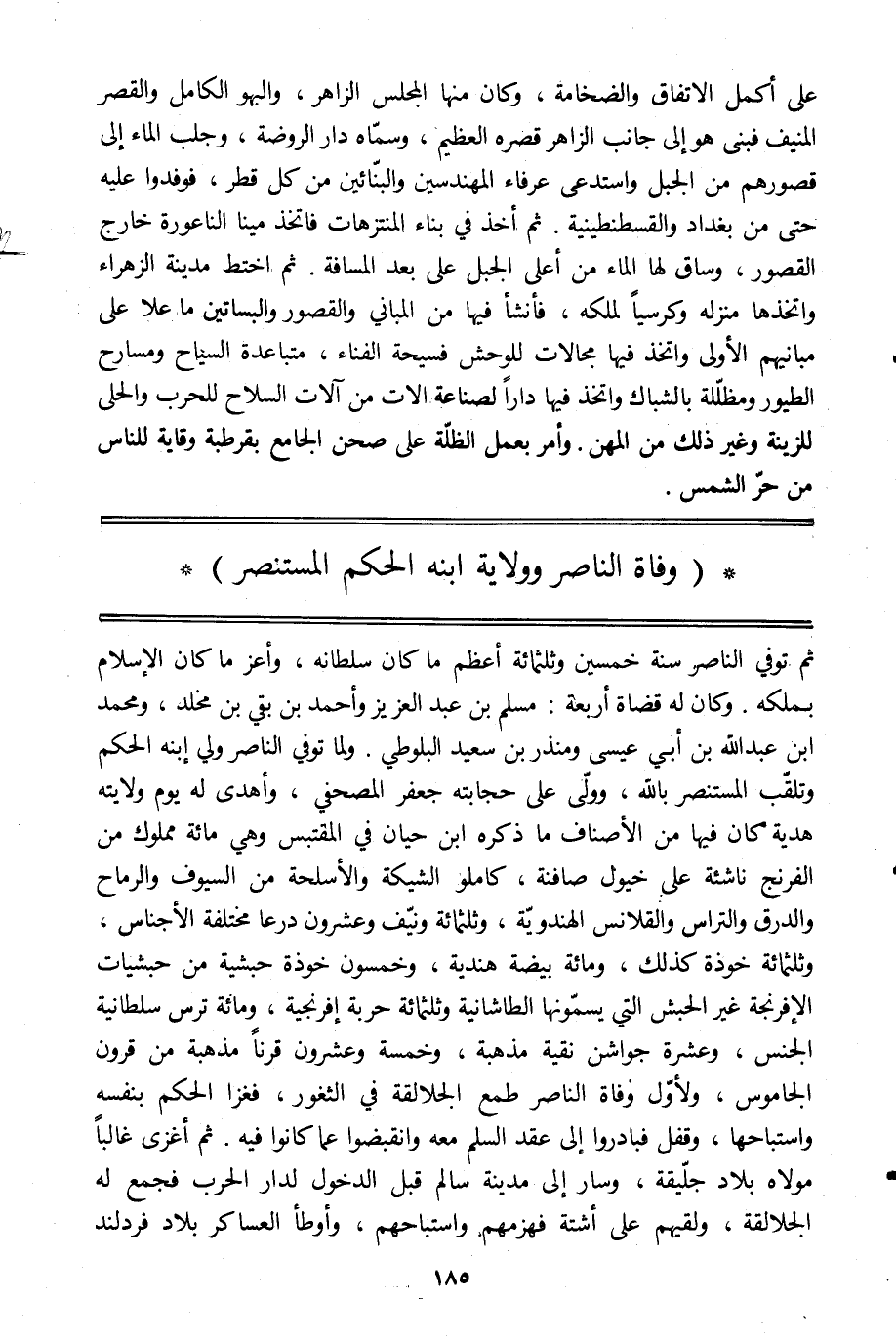 على أكمل الاتفاق والضخامة، وكان منها المجلس الزاهر، والبهو الكامل والقصر المنيف فبنى هو إلى جانب الزاهر قصره العظيم، وسمّاه دار الروضة، وجلب الماء إلى قصورهم من الجبل واستدعى عرفاء المهندسين والبنّاءين من كل قطر، فوفدوا عليه حتى من بغداد والقسطنطينية. ثم أخذ في بناء المنتزهات فاتخذ مينا الناعورة خارج القصور، وساق لها الماء من أعلى الجبل على بعد المسافة. ثم اختط مدينة الزهراء واتخذها منزله وكرسيا لملكه، فأنشأ فيها من المباني والقصور والبساتين ما علا على مبانيهم الأولى واتخذ فيها مجالات للوحش فسيحة الفناء، متباعدة السياح ومسارح الطيور ومظلّلة بالشباك واتخذ فيها دارا لصناعة آلات من آلات السلاح للحرب والحلي للزينة وغير ذلك من المهن. وأمر بعمل الظلّة على صحن الجامع بقرطبة وقاية للناس من حرّ الشمس.