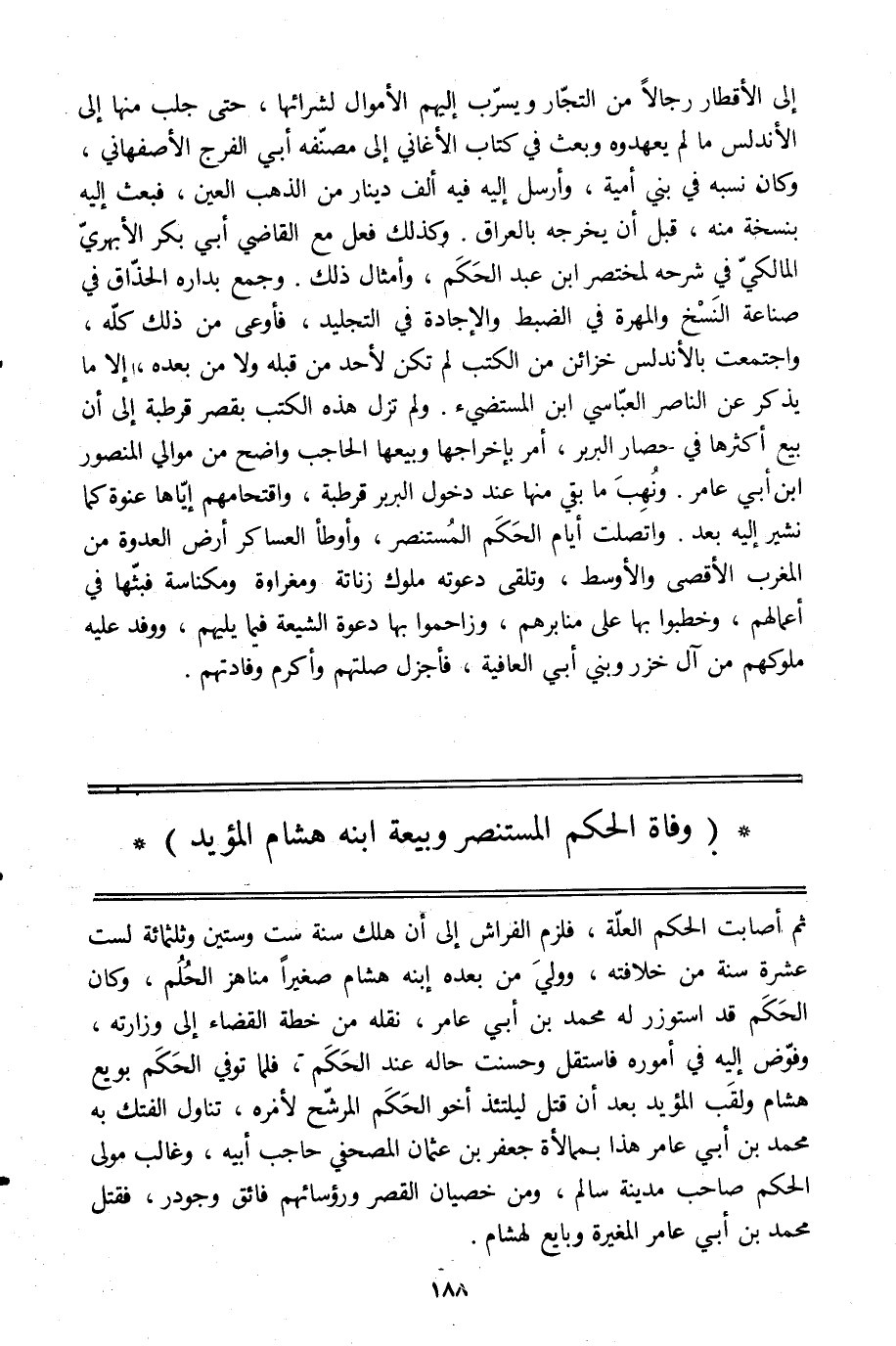 إلى الأقطار رجالا من التجّار ويسرّب إليهم الأموال لشرائها، حتى جلب منها إلى الأندلس ما لم يعهدوه وبعث في كتاب الأغاني إلى مصنّفه أبي الفرج الأصفهاني، وكان نسبه في بني أمية، وأرسل إليه فيه ألف دينار من الذهب العين، فبعث إليه بنسخة منه، قبل أن يخرجه بالعراق. وكذلك فعل مع القاضي أبي بكر الأبهريّ المالكيّ في شرحه لمختصر ابن عبد الحكم، وأمثال ذلك. وجمع بداره الحذّاق في صناعة النسخ والمهرة في الضبط والإجادة في التجليد، فأوعى من ذلك كلّه، واجتمعت بالأندلس خزائن من الكتب لم تكن لأحد من قبله ولا من بعده، إلا ما يذكر عن الناصر العبّاسي ابن المستضيء. ولم تزل هذه الكتب بقصر قرطبة إلى أن بيع أكثرها في حصار البربر، أمر بإخراجها وبيعها الحاجب واضح من موالي المنصور ابن أبي عامر. ونهب ما بقي منها عند دخول البربر قرطبة، واقتحامهم إيّاها عنوة كما نشير إليه بعد. واتصلت أيام الحكم المستنصر، وأوطأ العساكر أرض العدوة من المغرب الأقصى والأوسط، وتلقى دعوته ملوك زناتة ومغراوة ومكناسة فبثّها في أعمالهم، وخطبوا بها على منابرهم، وزاحموا بها دعوة الشيعة فيما يليهم، ووفد عليه ملوكهم من آل خزر وبني أبي العافية، فأجزل صلتهم وأكرم وفادتهم.