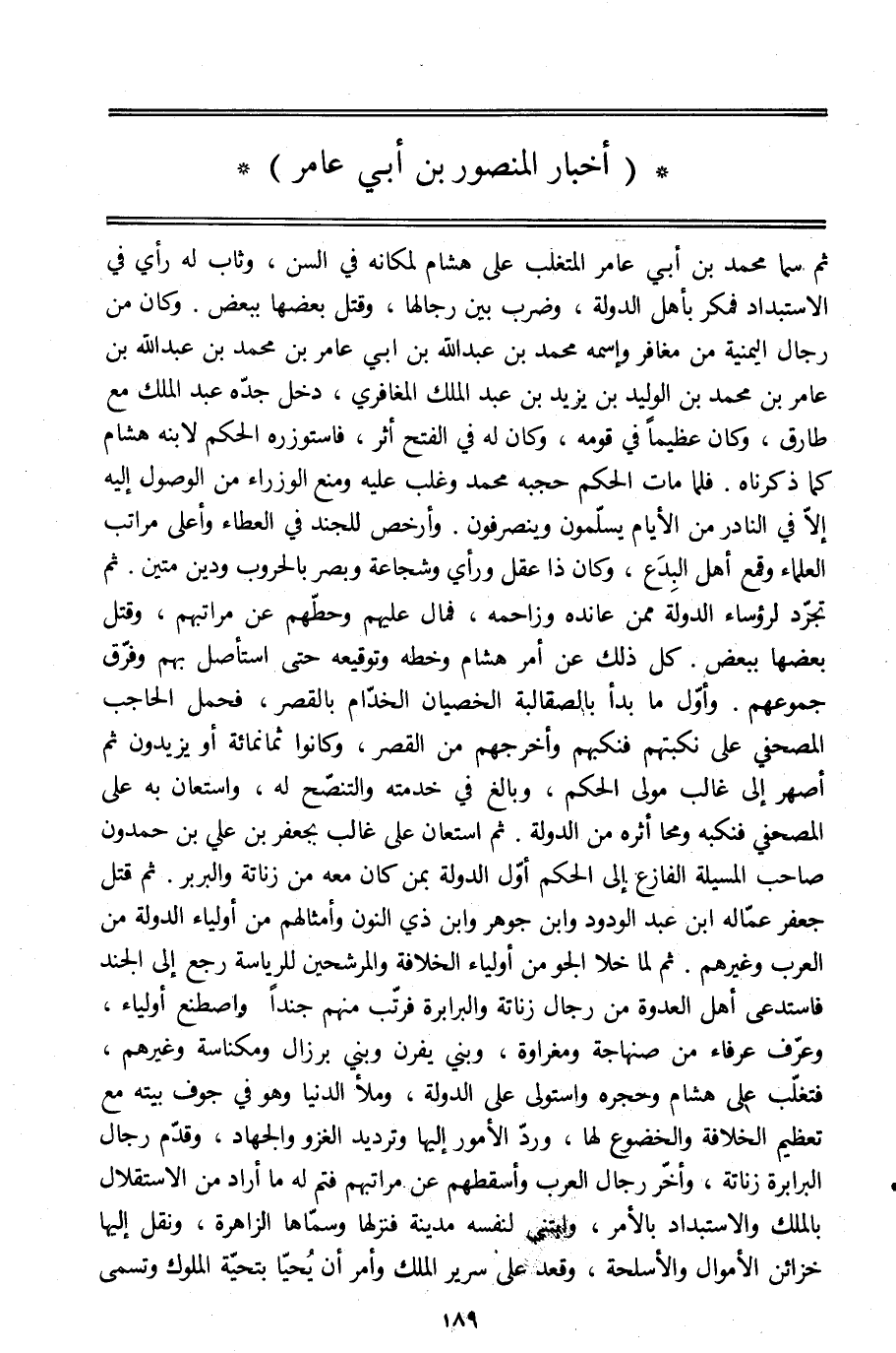 ثم سما محمد بن أبي عامر المتغلب على هشام لمكانه في السن، وثاب له رأي في الاستبداد فمكر بأهل الدولة، وضرب بين رجالها، وقتل بعضها ببعض. وكان من رجال اليمنية من مغافر واسمه محمد بن عبد الله بن أبي عامر بن محمد بن عبد الله بن عامر بن محمد بن الوليد بن يزيد بن عبد الملك المغافري، دخل جدّه عبد الملك مع طارق، وكان عظيما في قومه، وكان له في الفتح أثر، فاستوزره الحكم لابنه هشام كما ذكرناه. فلما مات الحكم حجبه محمد وغلب عليه ومنع الوزراء من الوصول إليه إلّا في النادر من الأيام يسلّمون وينصرفون. وأرخص للجند في العطاء وأعلى مراتب العلماء وقمع أهل البدع، وكان ذا عقل ورأي وشجاعة وبصر بالحروب ودين متين. ثم تجرّد لرؤساء الدولة ممن عانده وزاحمه، فمال عليهم وحطّهم عن مراتبهم، وقتل بعضها ببعض. كل ذلك عن أمر هشام وخطه وتوقيعه حتى استأصل بهم وفرّق جموعهم. وأوّل ما بدأ بالصقالبة الخصيان الخدّام بالقصر، فحمل الحاجب المصحفي على نكبتهم فنكبهم وأخرجهم من القصر، وكانوا ثمانمائة أو يزيدون ثم أصهر إلى غالب مولى الحكم، وبالغ في خدمته والتنصّح له، واستعان به على المصحفي فنكبه ومحا أثره من الدولة. ثم استعان على غالب بجعفر بن علي بن حمدون صاحب المسيلة الفازع إلى الحكم أوّل الدولة بمن كان معه من زناتة والبربر. ثم قتل جعفر عمّاله ابن عبد الودود وابن جوهر وابن ذي النون وأمثالهم من أولياء الدولة من العرب وغيرهم. ثم لما خلا الجو من أولياء الخلافة والمرشحين للرئاسة رجع إلى الجند فاستدعى أهل العدوة من رجال زناتة والبرابرة فرتّب منهم جندا واصطنع أولياء، وعرّف عرفاء من صنهاجة ومغراوة، وبني يفرن وبني برزال ومكناسة وغيرهم، فتغلّب على هشام وحجره واستولى على الدولة، وملأ الدنيا وهو في جوف بيته مع تعظيم الخلافة والخضوع لها، وردّ الأمور إليها وترديد الغزو والجهاد، وقدّم رجال البرابرة زناتة، وأخّر رجال العرب وأسقطهم عن مراتبهم فتم له ما أراد من الاستقلال بالملك والاستبداد بالأمر، وابتنى لنفسه مدينة فنزلها وسمّاها الزاهرة، ونقل إليها خزائن الأموال والأسلحة، وقعد على سرير الملك وأمر أن يحيّا بتحيّة الملوك وتسمى