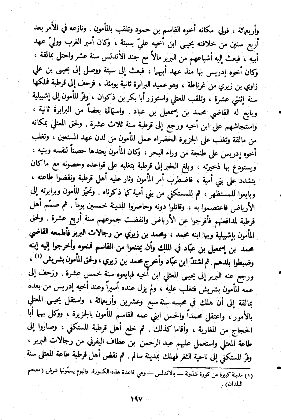 وأربعمائة، فولي مكانه أخوه القاسم بن حمود وتلقب بالمأمون. ونازعه في الأمر بعد أربع سنين من خلافته يحيى ابن أخيه عليّ بسبتة، وكان أمير الغرب ووليّ عهد أبيه، فبعث إليه أشياعهم من البربر مالا مع جند الأندلس سنة عشر واحتل بمالقة، وكان أخوه إدريس بها منذ عهد أبيهما، فبعث إلى سبتة ووصل إلى يحيى بن علي زاوي بن زيري من غرناطة، وهو عميد البرابرة ثانية يومئذ، فزحف إلى قرطبة فملكها سنة اثنتي عشرة، وتلقب المعتلي واستوزر أبا بكر بن ذكوان، وفرّ المأمون إلى إشبيلية وبايع له القاضي محمد بن إسماعيل بن عباد. واستمال بعضا من البرابرة ثانية، واستجاشهم على ابن أخيه ورجع إلى قرطبة سنة ثلاث عشرة. ولحق المعتلي بمكانه من مالقة وتغلب على الجزيرة الخضراء عمل المأمون من لدن عهد المستعين، وتغلب أخوه إدريس على طنجة من وراء البحر، وكان المأمون يعتدها حصنا لنفسه وبنيه، ويستودع بها ذخيرته، وبلغ الخبر إلى قرطبة بتغلبه على قواعده وحصونه مع ما كان يتشدد على بني أمية، فاضطرب أمر المأمون وثار عليه أهل قرطبة ونقضوا طاعته، وبايعوا للمستظهر، ثم للمستكفي من بني أمية كما ذكرناه. وتحيّز المأمون وبرابرته إلى الأرباض فاعتصموا به، وقاتلوا دونه وحاصروا المدينة خمسين يوما. ثم صمّم أهل قرطبة لمدافعتهم فأفرجوا عن الأرباض وانفضت جموعهم سنة أربع عشرة. ولحق المأمون بإشبيليّة وبها ابنه محمد، ومحمد بن زيري من رجالات البربر فأطمعه القاضي محمد بن إسماعيل بن عبّاد في الملك وأن يمتنعوا من القاسم فمنعوه وأخرجوا إليه ابنه وضبطوا بلدهم. ثم اشتدّ ابن عبّاد وأخرج محمد بن زيري، ولحق المأمون بشريش [1] ، ورجع عنه البربر إلى يحيى المعتلي ابن أخيه فبايعوه سنة خمس عشرة. وزحف إلى عمه المأمون بشريش فتغلب عليه، ولم يزل عنده أسيرا وعند أخيه إدريس من بعده بمالقة إلى أن هلك في محبسه سنة سبع وعشرين وأربعمائة، واستقل يحيى المعتلي بالأمور، واعتقل محمدا والحسن ابني عمه القاسم المأمون بالجزيرة، ووكل بهما أبا الحجاج من المغاربة، وأقاما كذلك. ثم خلع أهل قرطبة المستكفي، وصاروا إلى طاعة المعتلي واستعمل عليهم عبد الرحمن بن عطاف اليفرني من رجالات البربر، وفرّ المستكفي إلى ناحية الثغر فهلك بمدينة سالم. ثم نقض أهل قرطبة طاعة المعتلي سنة