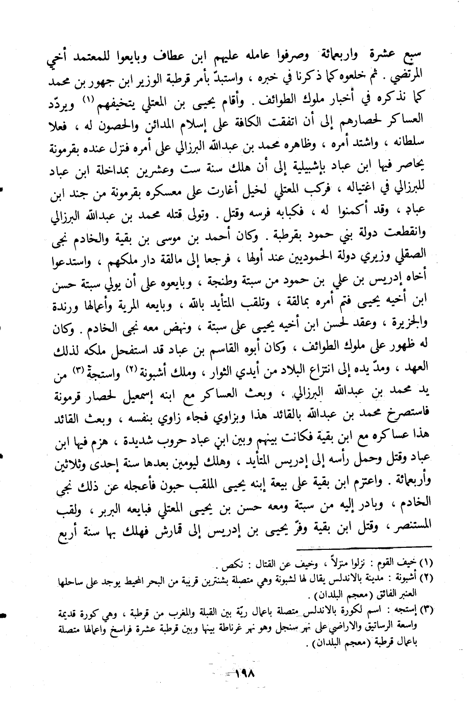 سبع عشرة واربعمائة وصرفوا عامله عليهم ابن عطاف وبايعوا للمعتمد أخي المرتضى. ثم خلعوه كما ذكرنا في خبره، واستبدّ بأمر قرطبة الوزير ابن جهور بن محمد كما نذكره في أخبار ملوك الطوائف. وأقام يحيى بن المعتلي يتخيفهم [1] ويردّد العساكر لحصارهم إلى أن اتفقت الكافة على إسلام المدائن والحصون له، فعلا سلطانه، واشتد أمره، وظاهره محمد بن عبد الله البرزالي على أمره فنزل عنده بقرمونة يحاصر فيها ابن عباد بإشبيليّة إلى أن هلك سنة ست وعشرين بمداخلة ابن عباد للبرزالي في اغتياله، فركب المعتلي لخيل أغارت على معسكره بقرمونة من جند ابن عباد، وقد أكمنوا له، فكبا به فرسه وقتل. وتولى قتله محمد بن عبد الله البرزالي وانقطعت دولة بني حمود بقرطبة. وكان أحمد بن موسى بن بقية والخادم نجى الصقلي وزيري دولة الحموديين عند أولها، فرجعا إلى مالقة دار ملكهم، واستدعوا أخاه إدريس بن علي بن حمود من سبتة وطنجة، وبايعوه على أن يولي سبتة حسن ابن أخيه يحيى فتم أمره بمالقة، وتلقب المتأيد باللَّه، وبايعه المرية وأعمالها ورندة والجزيرة، وعقد لحسن ابن أخيه يحيى على سبتة، ونهض معه نجى الخادم. وكان له ظهور على ملوك الطوائف، وكان أبوه القاسم بن عباد قد استفحل ملكه لذلك العهد، ومدّ يده إلى انتزاع البلاد من أيدي الثوار، وملك أشبونة [2] واستجة [3] من يد محمد بن عبد الله البرزالي، وبعث العساكر مع ابنه إسماعيل لحصار قرمونة فاستصرخ محمد بن عبد الله بالقائد هذا وبزاوي فجاء زاوي بنفسه، وبعث القائد هذا عساكره مع ابن بقية فكانت بينهم وبين ابن عباد حروب شديدة، هزم فيها ابن عباد وقتل وحمل رأسه إلى إدريس المتأيد، وهلك ليومين بعدها سنة إحدى وثلاثين وأربعمائة. واعتزم ابن بقية على بيعة ابنه يحيى الملقب حبون فأعجله عن ذلك نجى الخادم، وبادر إليه من سبتة ومعه حسن بن يحيى المعتلي فبايعه البربر، ولقب المستنصر، وقتل ابن بقية وفرّ يحيى بن إدريس إلى قمارش فهلك بها سنة أربع