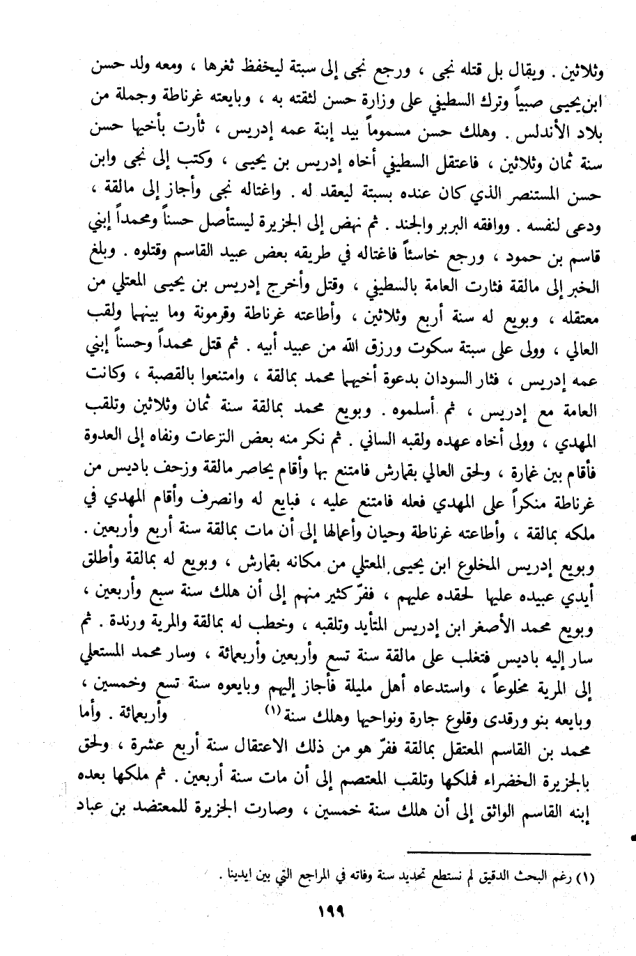 وثلاثين. ويقال بل قتله نجى، ورجع نجى إلى سبتة ليحفظ ثغرها، ومعه ولد حسن ابن يحيى صبيا وترك السطيفي على وزارة حسن لثقته به، وبايعته غرناطة وجملة من بلاد الأندلس. وهلك حسن مسموما بيد ابنة عمه إدريس، ثأرت بأخيها حسن سنة ثمان وثلاثين، فاعتقل السطيفي أخاه إدريس بن يحيى، وكتب إلى نجى وابن حسن المستنصر الّذي كان عنده بسبتة ليعقد له. واغتاله نجى وأجاز إلى مالقة، ودعي لنفسه. ووافقه البربر والجند. ثم نهض إلى الجزيرة ليستأصل حسنا ومحمدا ابني قاسم بن حمود، ورجع خاسئا فاغتاله في طريقه بعض عبيد القاسم وقتلوه. وبلغ الخبر إلى مالقة فثارت العامة بالسطيفي، وقتل وأخرج إدريس بن يحيى المعتلي من معتقله، وبويع له سنة أربع وثلاثين، وأطاعته غرناطة وقرمونة وما بينهما ولقب العالي، وولى على سبتة سكوت ورزق الله من عبيد أبيه. ثم قتل محمدا وحسنا ابني عمه إدريس، فثار السودان بدعوة أخيهما محمد بمالقة، وامتنعوا بالقصبة، وكانت العامة مع إدريس، ثم أسلموه. وبويع محمد بمالقة سنة ثمان وثلاثين وتلقب المهدي، وولى أخاه عهده ولقبه الساني. ثم نكر منه بعض النزعات ونفاه إلى العدوة فأقام بين غمارة، ولحق العالي بقمارش فامتنع بها وأقام يحاصر مالقة وزحف باديس من غرناطة منكرا على المهدي فعله فامتنع عليه، فبايع له وانصرف وأقام المهدي في ملكه بمالقة، وأطاعته غرناطة وحيان وأعمالها إلى أن مات بمالقة سنة أربع وأربعين.