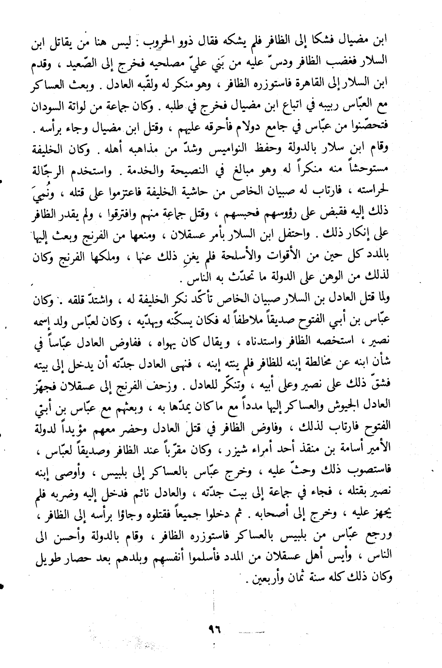 وقام ابن سلار بالدولة وحفظ النواميس وشدّ من مذاهبه أهله. وكان الخليفة مستوحشا منه منكرا له وهو مبالغ في النصيحة والخدمة. واستخدم الرجّالة لحراسته، فارتاب له صبيان الخاص من حاشية الخليفة فاعتزموا على قتله، ونمي ذلك إليه فقبض على رءوسهم فحبسهم، وقتل جماعة منهم وافترقوا، ولم يقدر الظافر على إنكار ذلك. واحتفل ابن السلار بأمر عسقلان، ومنعها من الفرنج وبعث إليها بالمدد كل حين من الأقوات والأسلحة فلم يغن ذلك عنها، وملكها الفرنج وكان لذلك من الوهن على الدولة ما تحدّث به الناس.