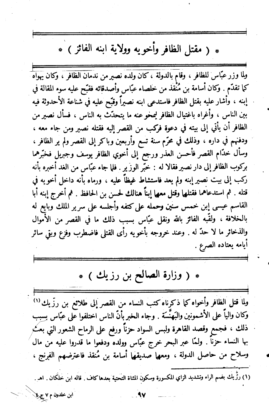 ولما قتل الظافر وأخواه كما ذكرناه كتب النساء من القصر إلى طلائع بن رزّيك [1] وكان واليا على الأشمونين والبهنّسة. وجاء الخبر بأنّ الناس اختلفوا على عبّاس بسبب ذلك، فجمع وقصد القاهرة ولبس السواد حزنا ورفع على الرماح الشعور التي بعث بها النساء حزنا. ولمّا عبر البحر خرج عبّاس وولده ودفعوا ما قدروا عليه من مال وسلاح من حاصل الدولة، ومعهما صديقهما أسامة بن منقذ فاعترضهم الفرنج،
