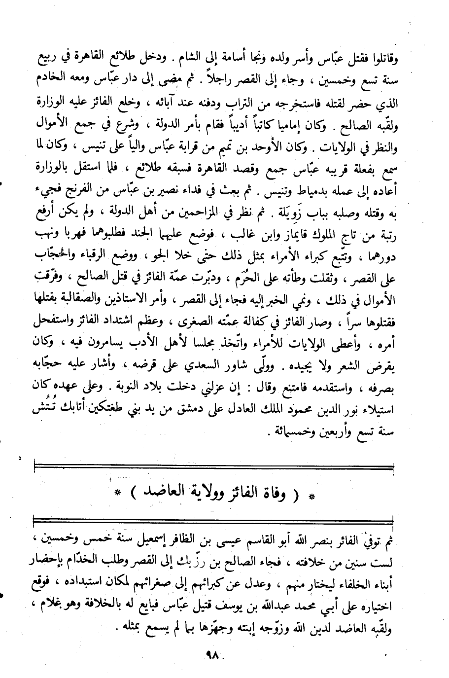 وقاتلوا فقتل عبّاس وأسر ولده ونجا أسامة إلى الشام. ودخل طلائع القاهرة في ربيع سنة تسع وخمسين، وجاء إلى القصر راجلا. ثم مضى إلى دار عبّاس ومعه الخادم الّذي حضر لقتله فاستخرجه من التراب ودفنه عند آبائه، وخلع الفائز عليه الوزارة ولقّبه الصالح. وكان إماميا كاتبا أديبا فقام بأمر الدولة، وشرع في جمع الأموال والنظر في الولايات. وكان الأوحد بن تميم من قرابة عبّاس واليا على تنيس، وكان لما سمع بفعلة قريبه عبّاس جمع وقصد القاهرة فسبقه طلائع، فلما استقل بالوزارة أعاده إلى عمله بدمياط وتنيس. ثم بعث في فداء نصير بن عبّاس من الفرنج فجيء به وقتله وصلبه بباب زويلة. ثم نظر في المزاحمين من أهل الدولة، ولم يكن أرفع رتبة من تاج الملوك قايماز وابن غالب، فوضع عليهما الجند فطلبوهما فهربا ونهب دورهما، وتتّبع كبراء الأمراء بمثل ذلك حتى خلا الجو، ووضع الرقباء والحجّاب على القصر، وثقلت وطأته على الحرم، ودبّرت عمّة الفائز في قتل الصالح، وفرّقت الأموال في ذلك، ونمي الخبر إليه فجاء إلى القصر، وأمر الاستاذين والصقالبة بقتلها فقتلوها سرا، وصار الفائز في كفالة عمّته الصغرى، وعظم اشتداد الفائز واستفحل أمره، وأعطى الولايات للأمراء واتّخذ مجلسا لأهل الأدب يسامرون فيه، وكان يقرض الشعر ولا يجيده. وولّى شاور السعدي على قرضه، وأشار عليه حجّابه بصرفه، واستقدمه فامتنع وقال: إن عزلني دخلت بلاد النوبة. وعلى عهده كان استيلاء نور الدين محمود الملك العادل على دمشق من يد بني طغتكين أتابك تتش سنة تسع وأربعين وخمسمائة.