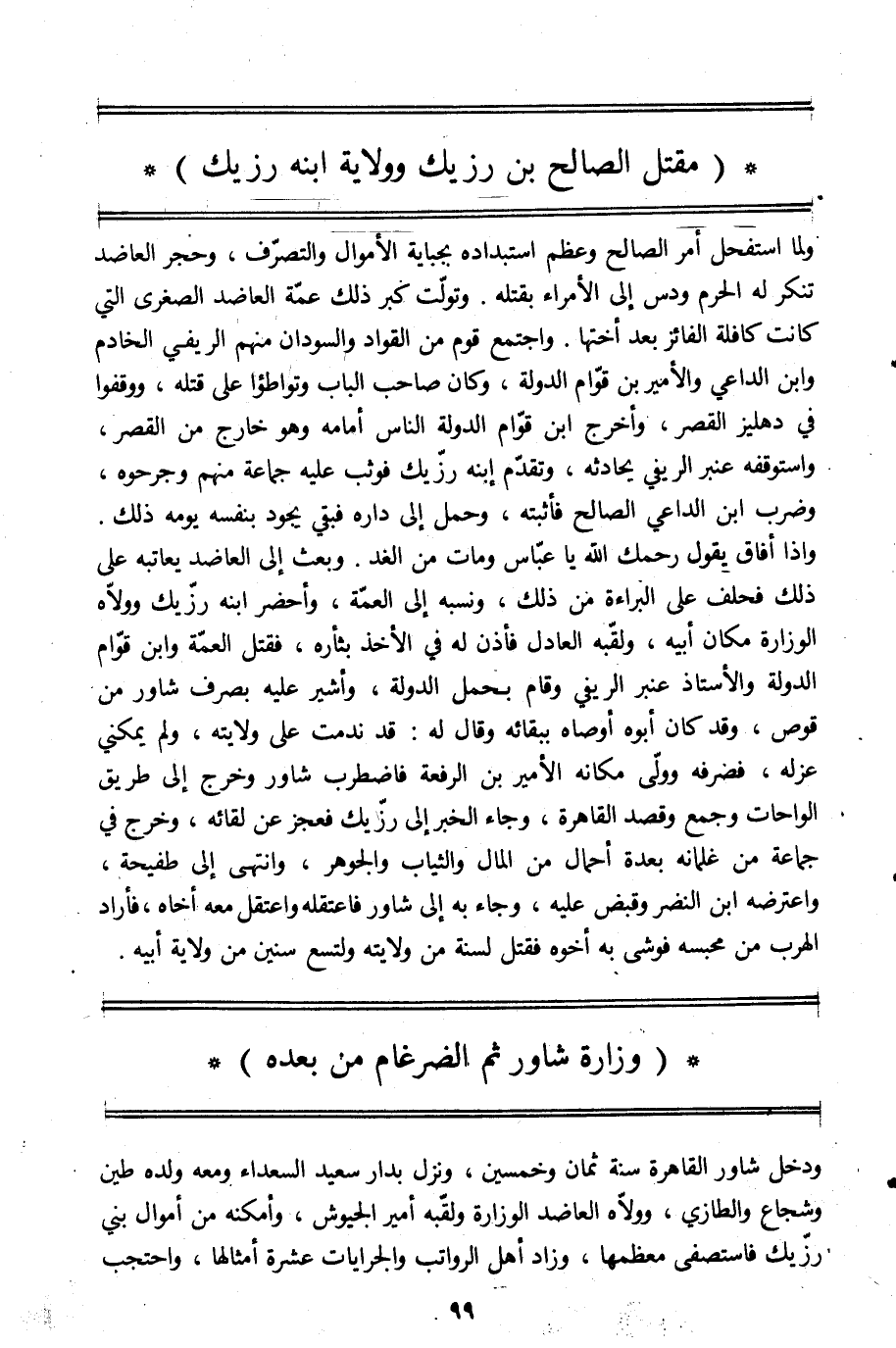 وإذا أفاق يقول رحمك الله يا عبّاس ومات من الغد. وبعث إلى العاضد يعاتبه على ذلك فحلف على البراءة من ذلك، ونسبه إلى العمّة، وأحضر ابنه رزّيك وولّاه الوزارة مكان أبيه، ولقّبه العادل فأذن له في الأخذ بثأره، فقتل العمّة وابن قوّام الدولة والأستاذ عنبر الريفي وقام بحمل الدولة، وأشير عليه بصرف شاور من قوص، وقد كان أبوه أوصاه ببقائه وقال له: قد ندمت على ولايته، ولم يمكني عزله، فصرفه وولّى مكانه الأمير بن الرفعة فاضطرب شاور وخرج إلى طريق الواحات وجمع وقصد القاهرة، وجاء الخبر إلى رزّيك فعجز عن لقائه، وخرج في جماعة من غلمانه بعدة أحمال من المال والثياب والجوهر، وانتهى إلى طفيحة، واعترضه ابن النضر وقبض عليه، وجاء به إلى شاور فاعتقله واعتقل معه أخاه، فأراد الهرب من محبسه فوشى به أخوه فقتل لسنة من ولايته ولتسع سنين من ولاية أبيه.