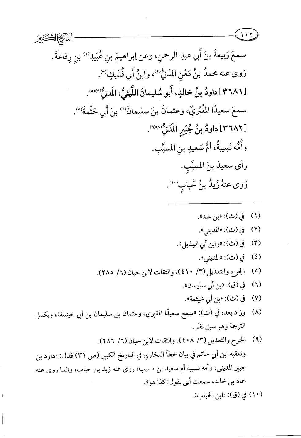 وتعقبه ابن أبي حاتم في بيان خطأ البخاري في التاريخ الكبير (ص ٣١) فقال: "داود بن جبير المدينى، وأمه نسيبة أم سعيد بن مسيب، روى عنه زيد بن حباب، وإنما روى عنه حماد بن خالد، سمعت أبى يقول: كذا هو".