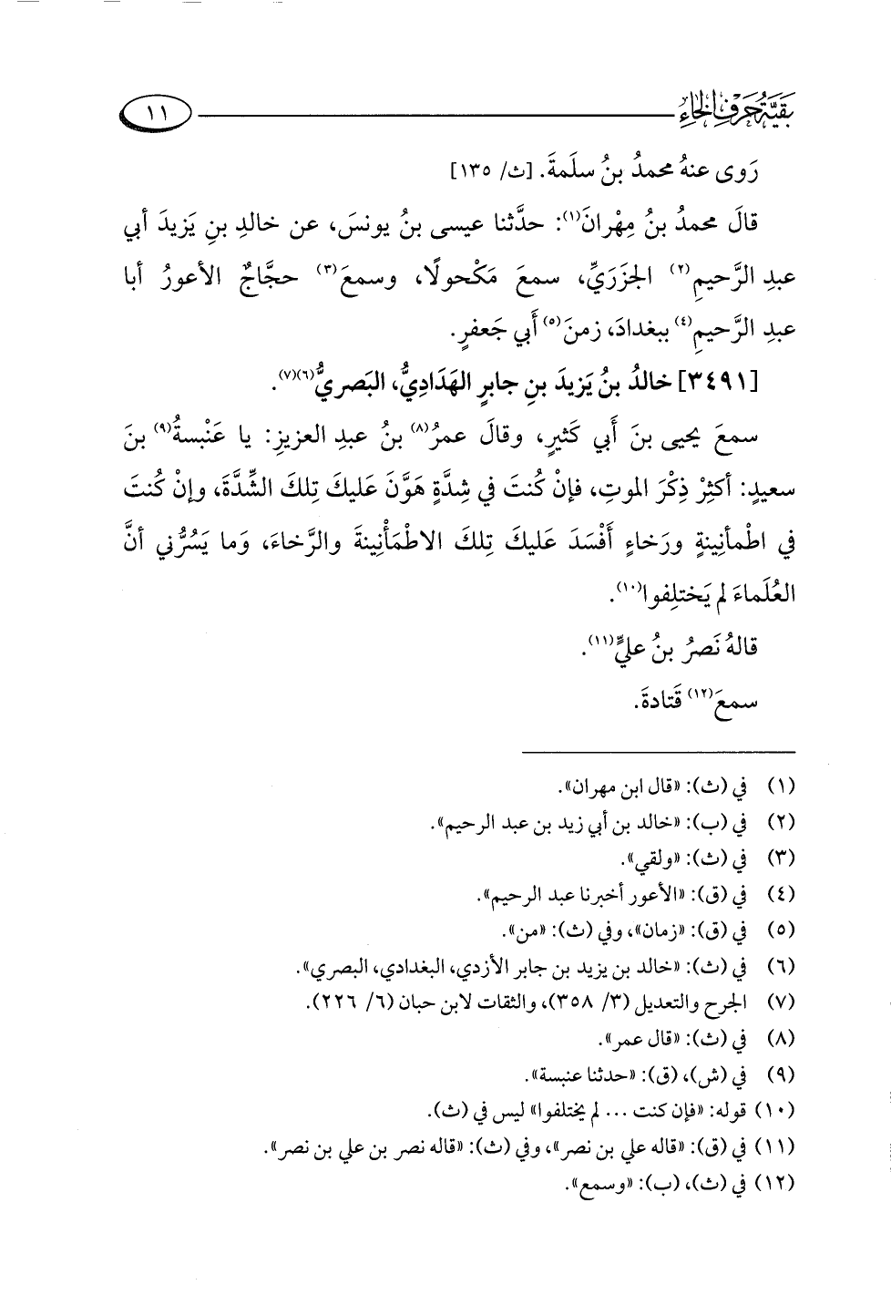 قالَ محمدُ بنُ مِهْرانَ (¬١): حدَّثنا عيسى بنُ يونسَ، عن خالدِ بنِ يَزيدَ أبي عبدِ الرَّحيمِ (¬٢) الجزَرَيِّ، سمعَ مَكْحولًا، وسمعَ (¬٣) حجَّاجٌ الأعورُ أبا عبدِ الرَّحيمِ (¬٤) ببغدادَ، زمنَ (¬٥) أَبي جَعفرٍ.