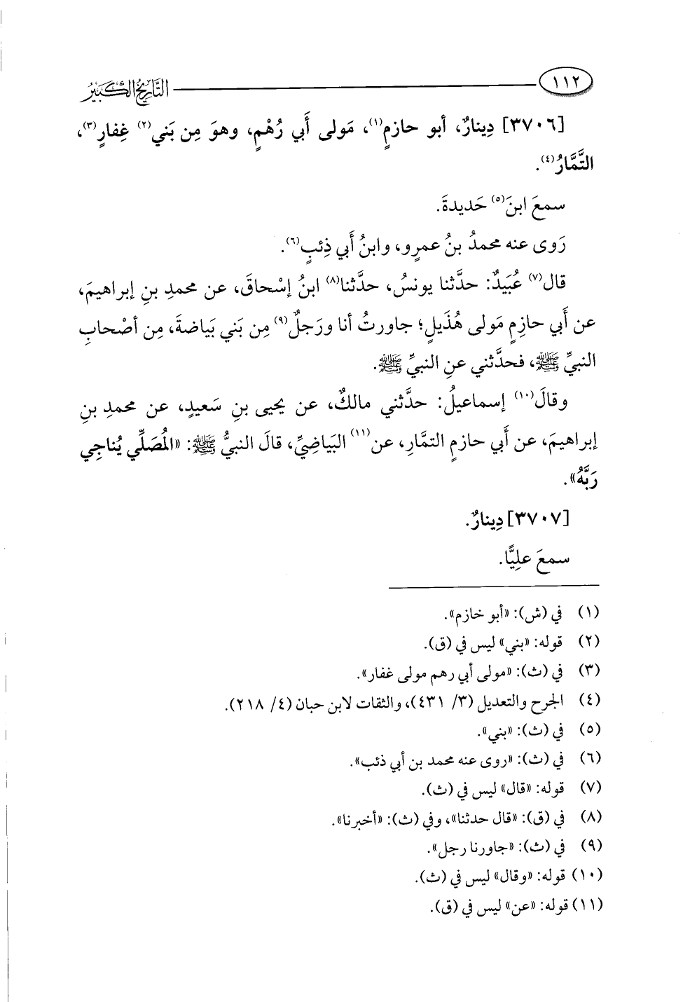 [٣٧٠٦] دِينارٌ، أبو حازمٍ (¬١)، مَولى أَبي رُهْمٍ، وهوَ مِن بَني (¬٢) غِفارٍ (¬٣)، التَّمَّارُ (¬٤).