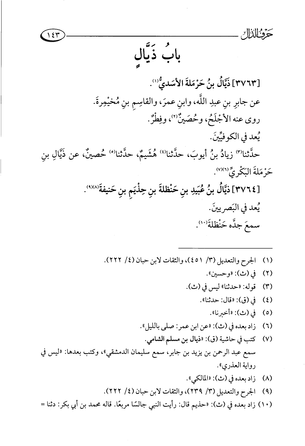 حدَّثنا (¬٣) زيادُ بنُ أيوبَ، حدَّثنا (¬٤) هُشَيمٌ، حدَّثنا (¬٥) حُصينٌ، عن ذَيَّالِ بنِ حَرْمَلةَ البَكْريِّ (¬٦) (¬٧).