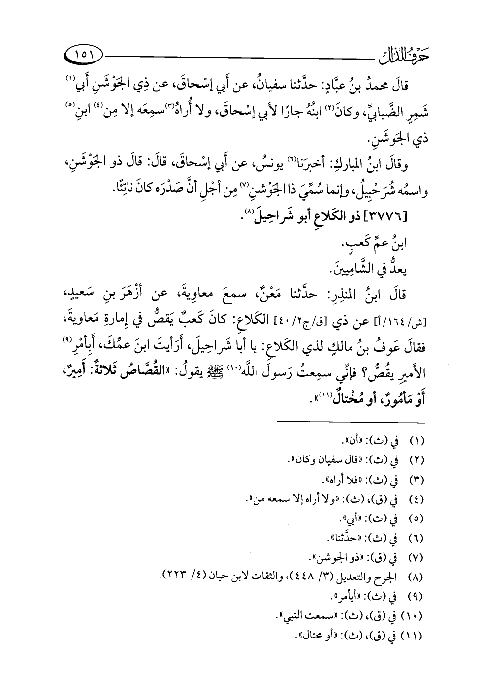 قالَ محمدُ بنُ عبَّادٍ: حدَّثنا سفيانُ، عن أَبي إسْحاقَ، عن ذِي الجَوْشَنِ أَبي (¬١) شَمِرٍ الضَّبابيِّ، وكانَ (¬٢) ابنُهُ جارًا لأبي إسْحاقَ، ولا أُراهُ (¬٣) سمِعَه إلا مِن (¬٤) ابنِ (¬٥) ذي الجَوشَنِ.