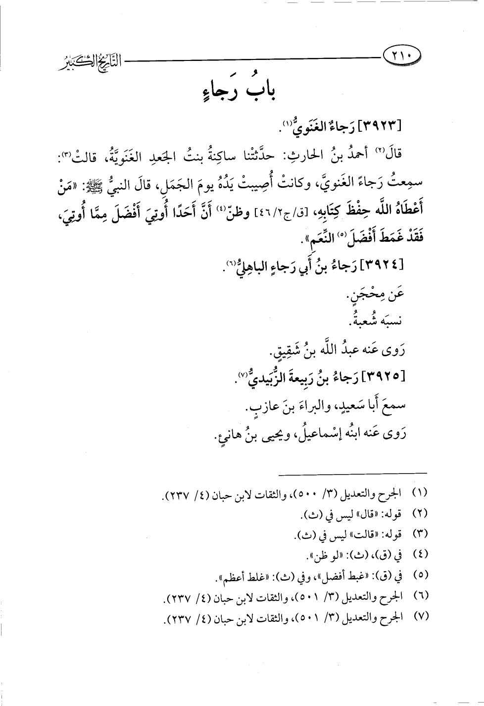 قالَ (¬٢) أحمدُ بنُ الحارثِ: حدَّثتْنا ساكِنةُ بنتُ الجَعدِ الغَنَويَّةُ، قالتْ (¬٣): سمِعتُ رَجاءً الغَنويَّ، وكانتْ أُصِيبتْ يَدُهُ يومَ الجَمَلِ، قالَ النبيُّ -صلى اللَّه عليه وسلم-: "مَنْ أَعْطَاهُ اللَّه حِفْظَ كِتَابهِ، وظنّ (¬٤) أَنَّ أَحَدًا أُوتِيَ أَفْضَلَ مِمَّا أُوتِيَ، فَقَدْ غَمَطَ أَفْضَلَ (¬٥) النِّعَمِ".