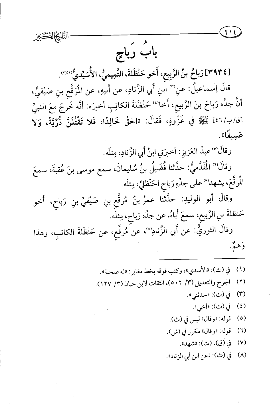 قالَ إسَماعيلُ: عنِ (¬٣) ابنِ أبي الزِّنادِ، عن أَبيهِ، عن المُرَقَّعِ بنِ صَيْفيٍّ، أنَّ جدَّه رَباحَ بنَ الرَّبيعِ، أَخا (¬٤) حَنْظَلةَ الكاتِبِ أخبرَه: أنَّه خَرجَ معَ النبيِّ -صلى اللَّه عليه وسلم- في غَزْوةٍ، فَقالَ: "الحقْ خَالِدًا، فَلا تَقْتُلَنَّ ذُرِّيَّةً، وَلا عَسِيفًا".