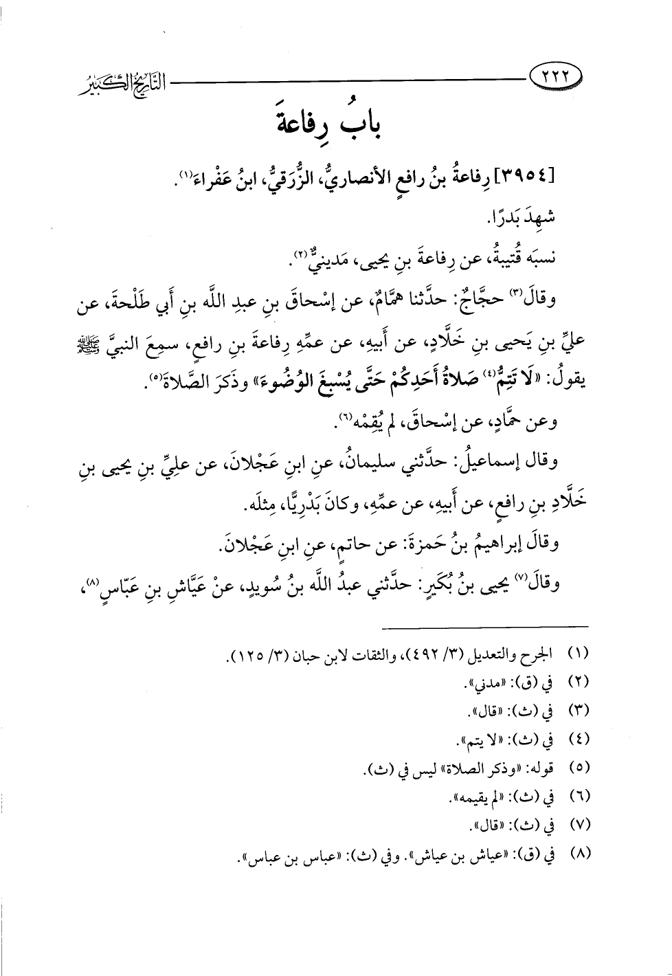 وقالَ (¬٣) حجَّاجٌ: حدَّثنا همَّامٌ، عن إسْحاقَ بنِ عبدِ اللَّه بنِ أَبي طَلْحةَ، عن عليِّ بنِ يَحيى بنِ خَلَّادٍ، عن أَبيهِ، عن عمِّهِ رِفاعةَ بنِ رافعٍ، سمِعَ النبيَّ -صلى اللَّه عليه وسلم- يقولُ: "لَا تَتِمُّ (¬٤) صَلاةُ أَحَدِكُمْ حَتَّى يُسْبغَ الوُضُوءَ" وذَكرَ الصَّلاةَ (¬٥).