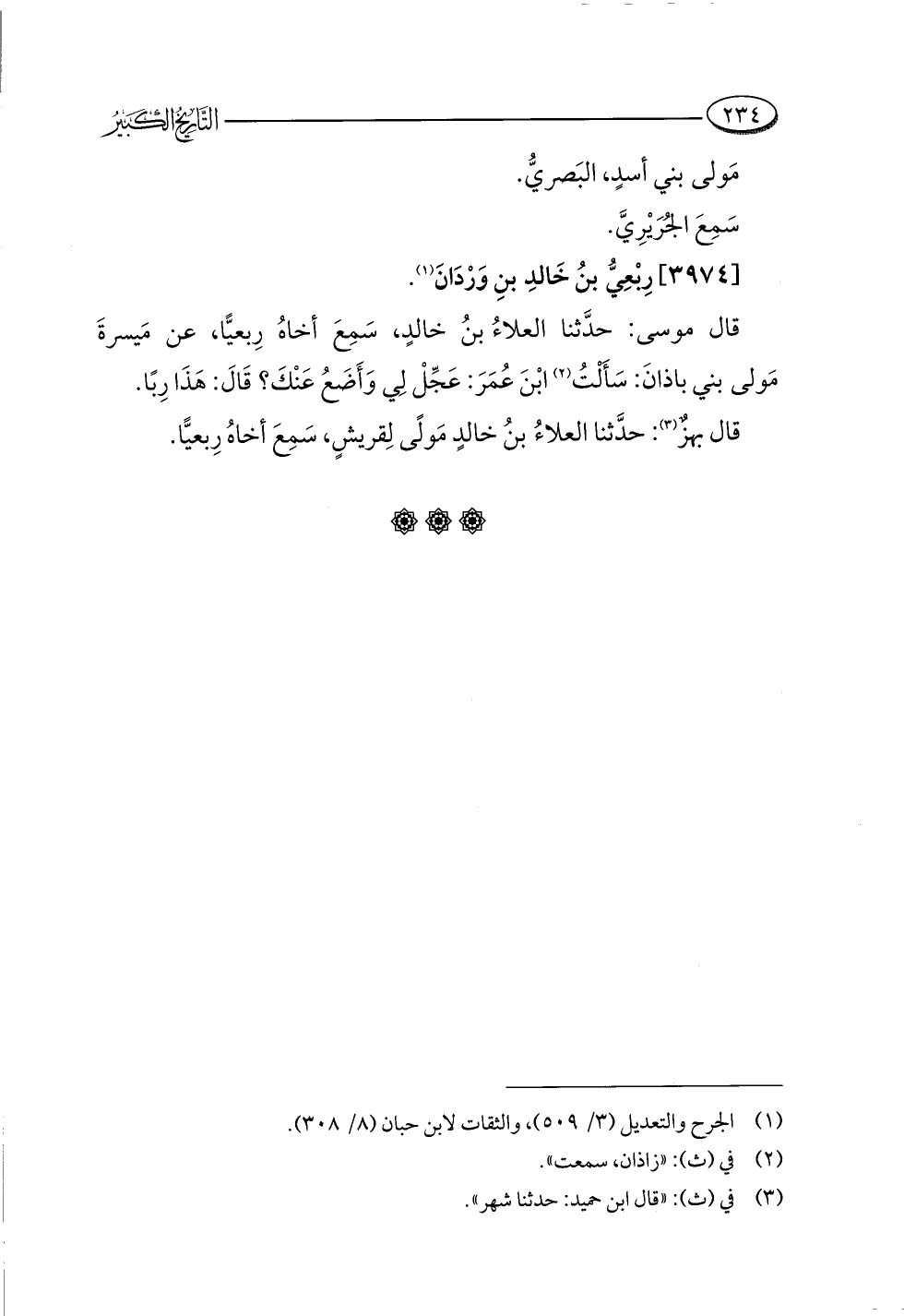 قال بهزٌ (¬٣): حدَّثنا العلاءُ بنُ خالدٍ مَولًى لِقريشٍ، سَمِعَ أخاهُ رِبعيًّا.
