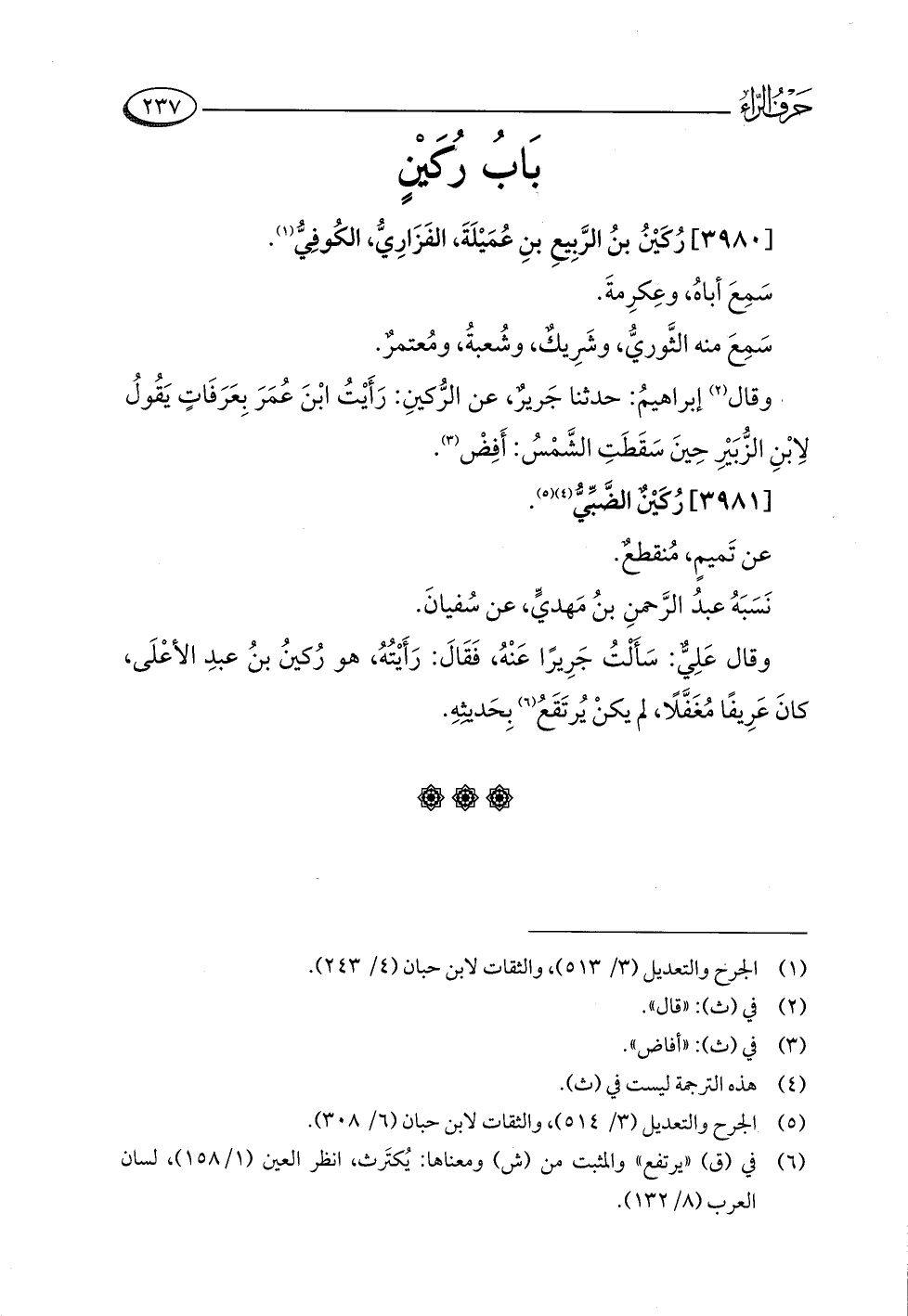 وقال عَلِيٌّ: سَأَلْتُ جَرِيرًا عَنْهُ، فَقَالَ: رَأَيْتُهُ، هو رُكينُ بنُ عبدِ الأعْلَى، كانَ عَرِيفًا مُغَفَّلًا، لم يكنْ يُرتَقَعُ (¬٦) بِحَديثِهِ.