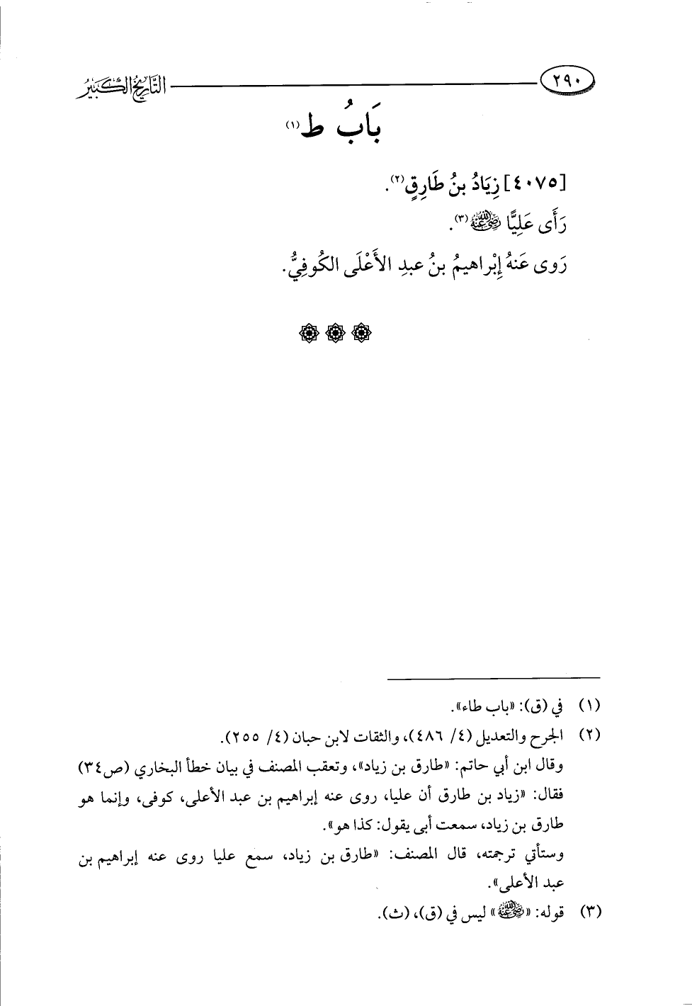 وقال ابن أبي حاتم: "طارق بن زياد"، وتعقب المصنف في بيان خطأ البخاري (ص ٣٤) فقال: "زياد بن طارق أن عليا، روى عنه إبراهيم بن عبد الأعلى، كوفي، وإنما هو طارق بن زياد، سمعت أبي يقول: كذا هو".