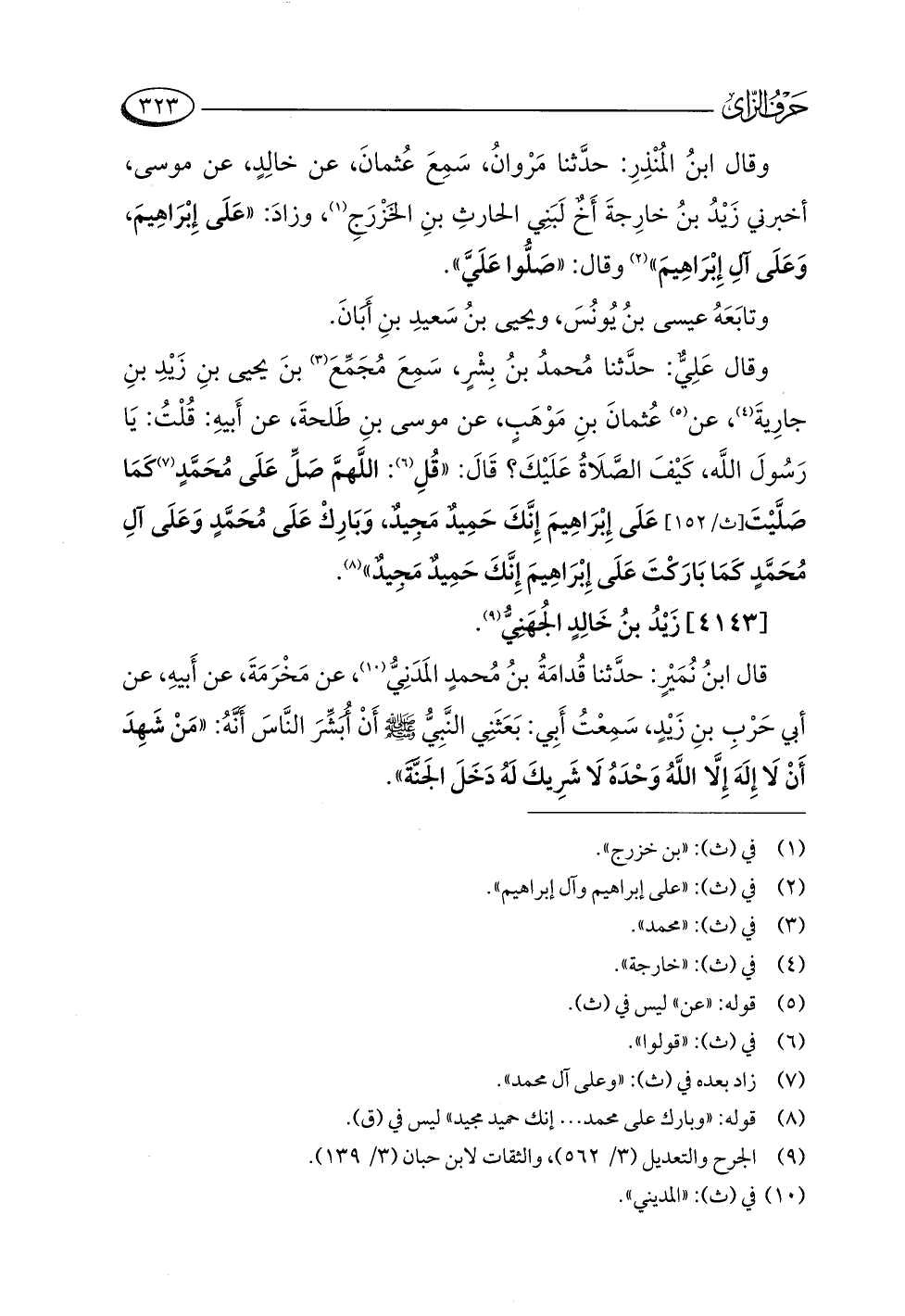 وقال ابنُ المُنْذِرِ: حدَّثنا مَرْوانُ، سَمِعَ عُثمانَ، عن خالِدٍ، عن موسى، أخبرني زَيْدُ بنُ خارِجةَ أَخٌ لَبَنِي الحارثِ بنِ الخَزْرَجِ (¬١)، وزادَ: "عَلَى إِبْرَاهِيمَ، وَعَلَى آلِ إِبْرَاهِيمَ" (¬٢) وقال: "صَلُّوا عَلَيَّ".
