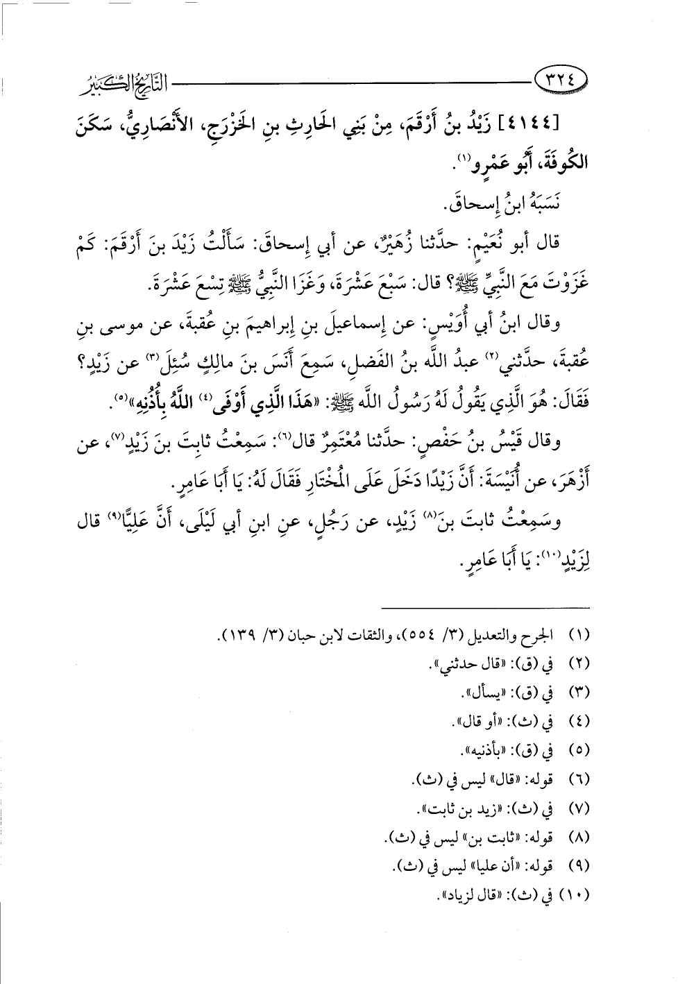 قال أبو نُعَيْمٍ: حدَّثنا زُهَيرٌ عن أبي إِسحاقَ: سَأَلْتُ زَيْدَ بنَ أَرْقَمَ: كَمْ غَزَوْتَ مَعَ النَّبِيِّ -صلى اللَّه عليه وسلم-؟ قال: سَبْعَ عَشْرَةَ، وَغَزَا النَّبِيُّ -صلى اللَّه عليه وسلم- تِسْعَ عَشْرَةَ.