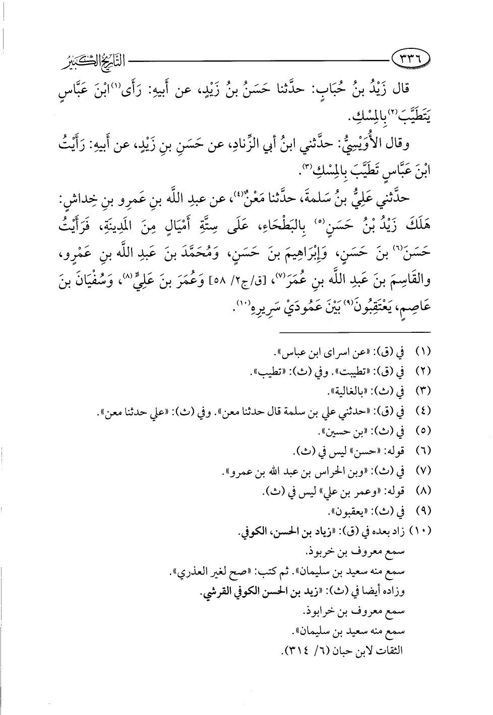 قال زَيْدُ بنُ حُبَابٍ: حدَّثنا حَسَنُ بنُ زَيْدٍ، عن أَبيهِ: رَأَى (¬١) ابْنَ عَبَّاسٍ يَتَطَيَّبَ (¬٢) بِالمِسْكِ.