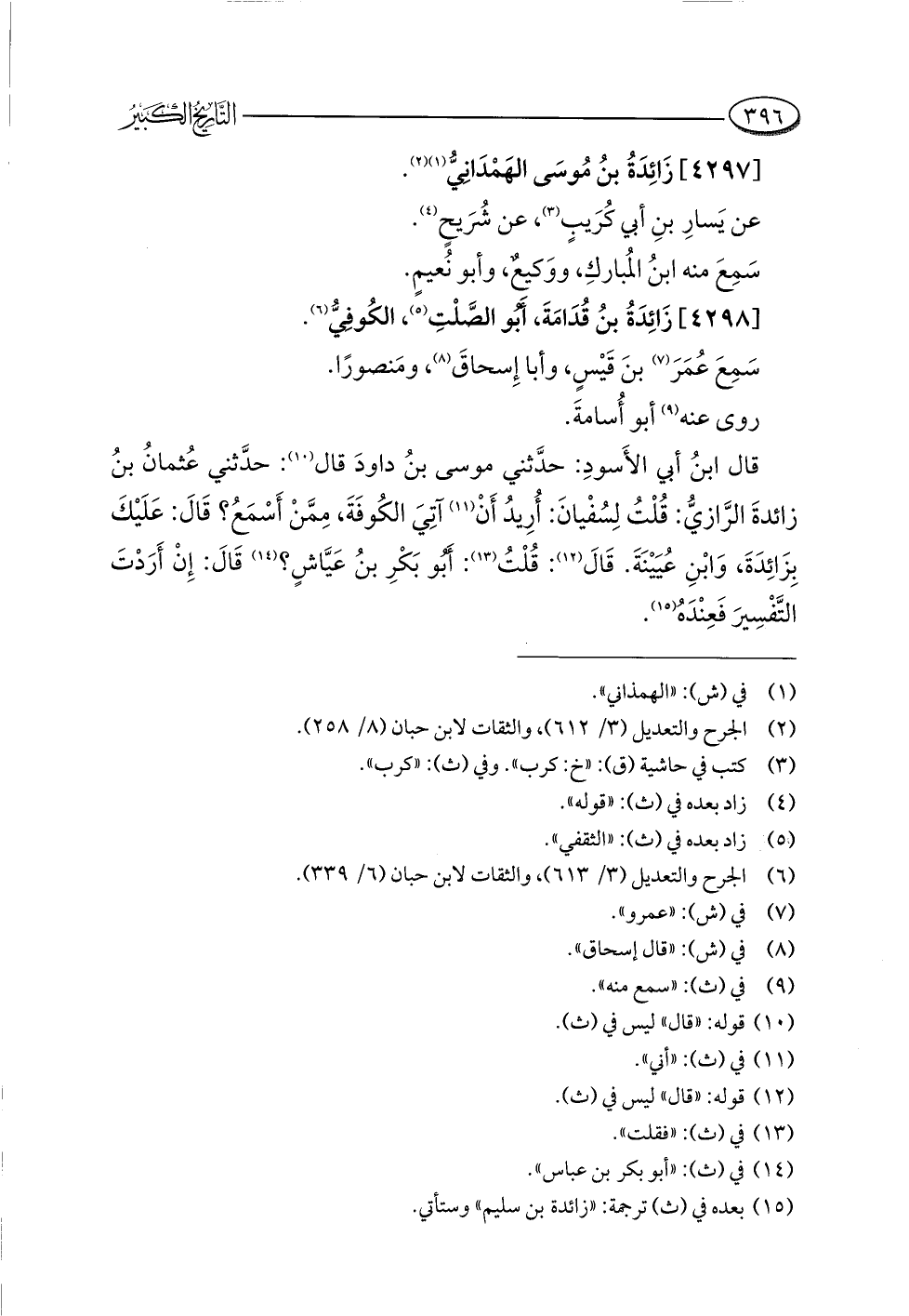 قال ابنُ أبي الأَسودِ: حدَّثني موسى بنُ داودَ قال (¬١٠): حدَّثني عُثمانُ بنُ زائدةَ الرَّازيُّ: قُلْتُ لِسُفْيانَ: أُرِيدُ أَنْ (¬١١) آتِيَ الكُوفَةَ، مِمَّنْ أَسْمَعُ؟ قَالَ: عَلَيْكَ بِزَائِدَةَ، وَابْنِ عُيَيْنَةَ. قَالَ (¬١٢): قُلْتُ (¬١٣): أَبُو بَكْرِ بنُ عَيَّاشٍ؟ (¬١٤) قال: إِنْ أَرَدْتَ التَّفْسِيرَ فَعِنْدَهُ (¬١٥).