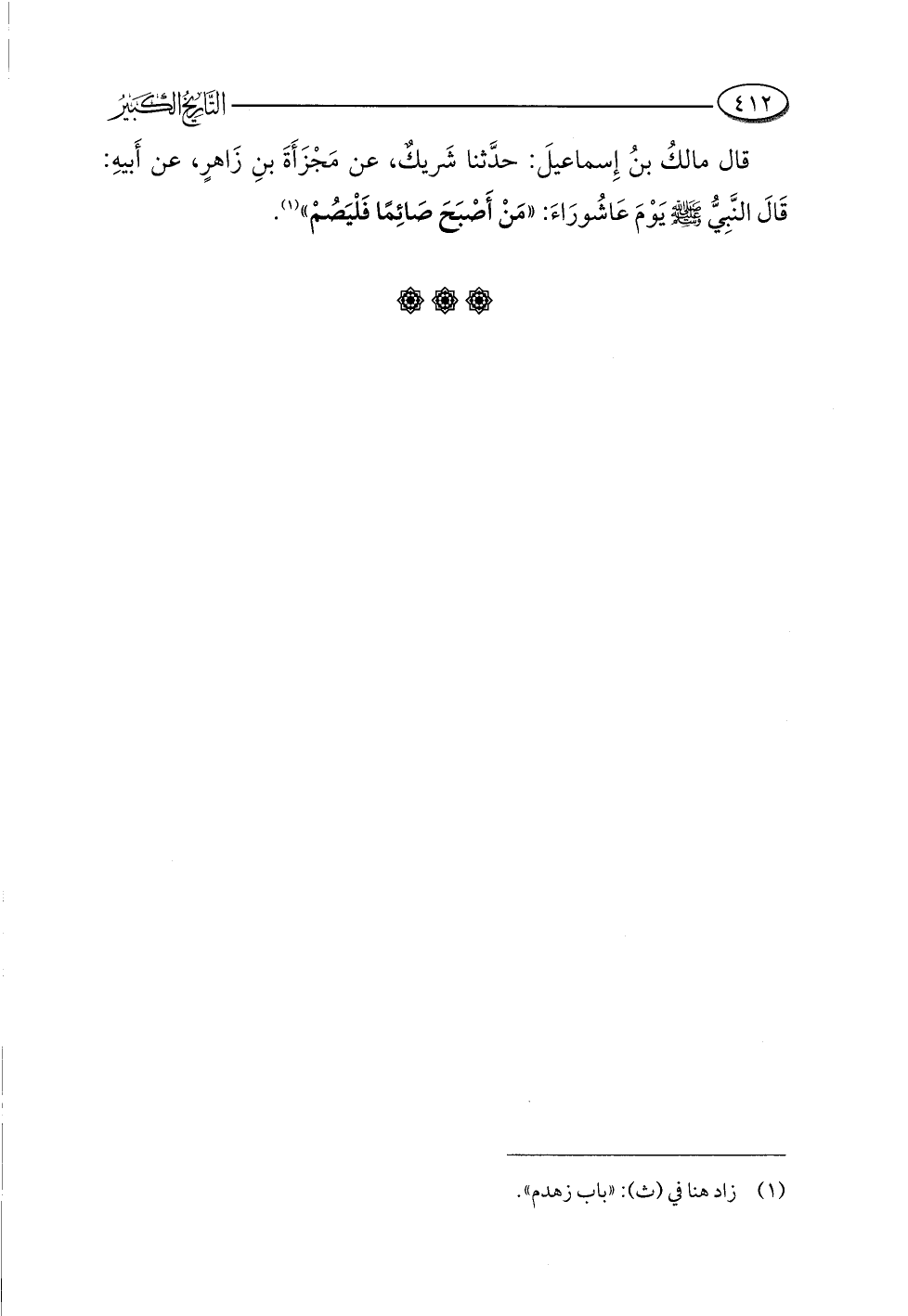 قال مالكُ بنُ إِسماعيلَ: حدَّثنا شَريكٌ، عن مَجْزَأَةَ بنِ زَاهرٍ، عن أَبيهِ: قال النَّبِيُّ -صلى اللَّه عليه وسلم- يَوْمَ عَاشُورَاءَ: "مَنْ أَصْبَحَ صَائِمًا فَلْيَصُمْ" (¬١).